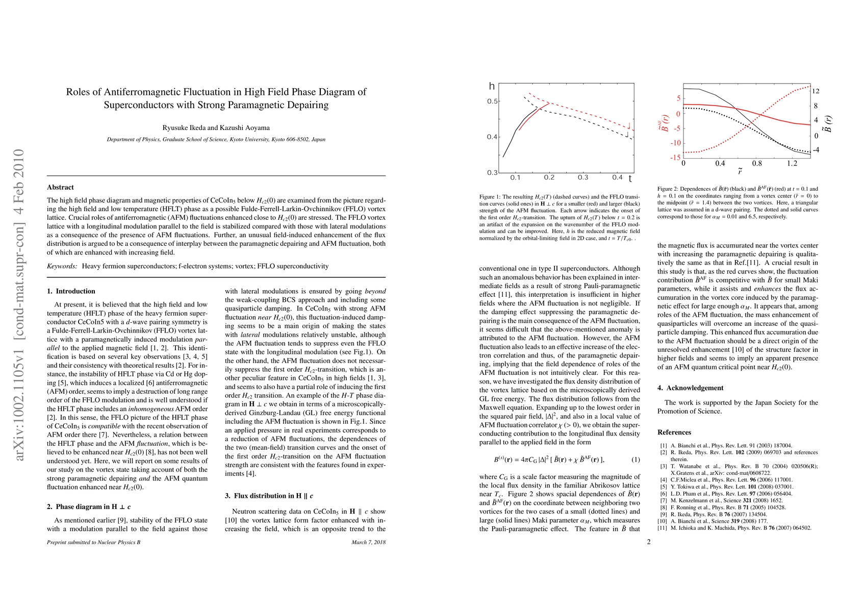 This paper explores the high field phase diagram of CeCoIn_5, emphasizing the stabilization of a Fulde-Ferrell-Larkin-Ovchinnikov (FFLO) vortex lattice due to antiferromagnetic fluctuations, which enhance the longitudinal modulation parallel to the field. The study highlights the interplay between paramagnetic depairing and antiferromagnetic fluctuations, leading to an unusual field-induced enhancement of flux distribution.