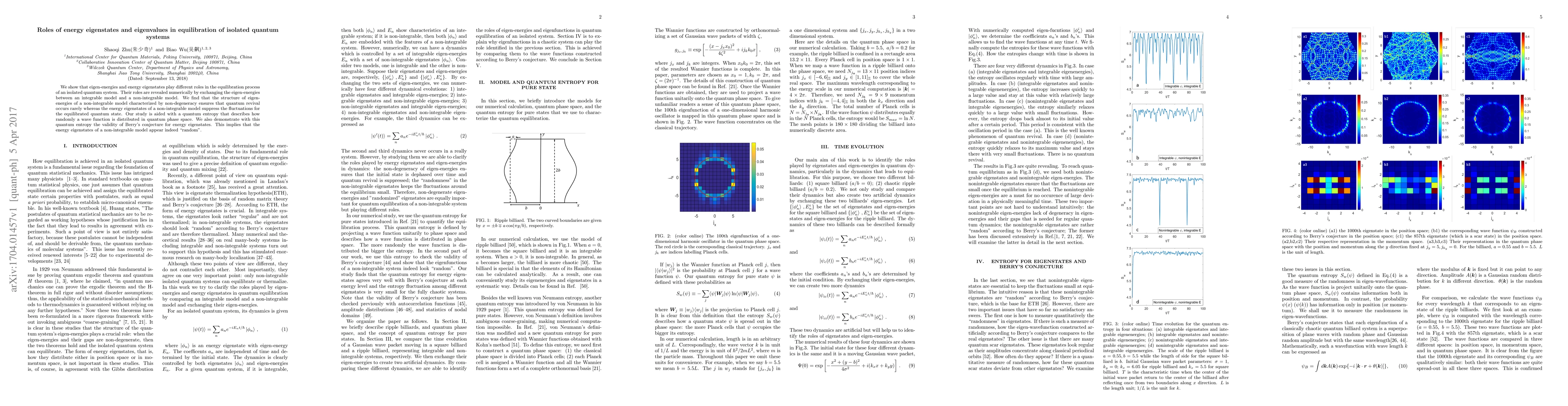 This paper investigates the distinct roles of energy eigenstates and eigenvalues in the equilibration of isolated quantum systems, showing that non-degenerate eigenenergies in non-integrable models lead to rare quantum revivals, while energy eigenstates suppress fluctuations in the equilibrated state. The study uses quantum entropy to validate Berry's conjecture on the randomness of energy eigenstates in non-integrable systems.