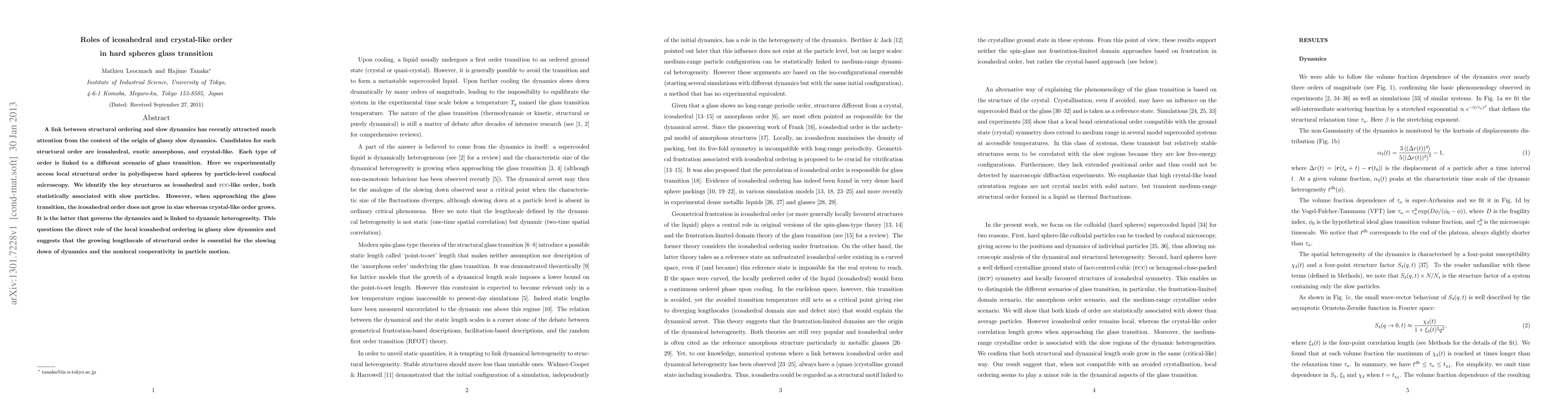 A link between structural ordering and slow dynamics has recently attracted much attention from the context of the origin of glassy slow dynamics. Candidates for such structural order are icosahedral, exotic amorphous, and crystal-like. Each type of order is linked to a different scenario of glass transition. Here we experimentally access local structural order in polydisperse hard spheres by particle-level confocal microscopy. We identify the key structures as icosahedral and FCC-like order, both statistically associated with slow particles. However, when approaching the glass transition, the icosahedral order does not grow in size whereas crystal-like order grows. It is the latter that governs the dynamics and is linked to dynamic heterogeneity. This questions the direct role of the local icosahedral ordering in glassy slow dynamics and suggests that the growing lengthscale of structural order is essential for the slowing down of dynamics and the nonlocal cooperativity in particle motion.