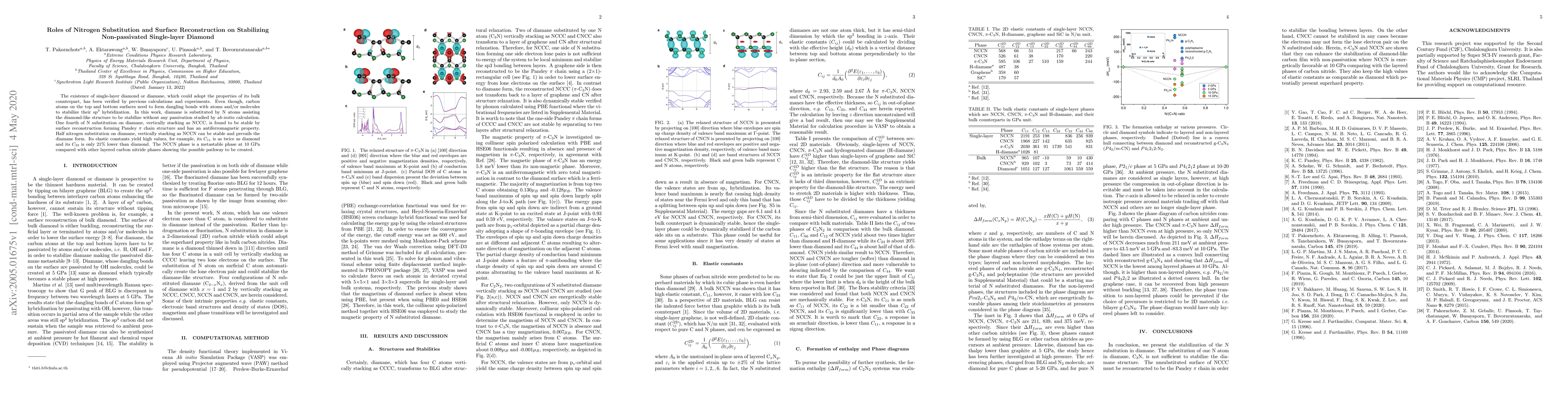 Single-layer diamond or diamane is substituted by N atoms assisting the diamond-like structure to be stabilize without any passivation. One fourth of N substitution in diamane, vertically stacking as NCCC, is found to be stable by surface reconstruction forming Pandey $\pi$ chain structure and has an antiferromagnetic property. Half N substitution in diamane, vertically stacking as NCCN can be stable and prevails the diamane form. Its elastic constants yield high values, for example, its $C_{11}$ is as twice as diamond and its $C_{33}$ is only 21\% lower than diamond. The NCCN phase is a metastable phase at 10 GPa compared with other layered carbon nitride phases showing the possible pathway to be created.