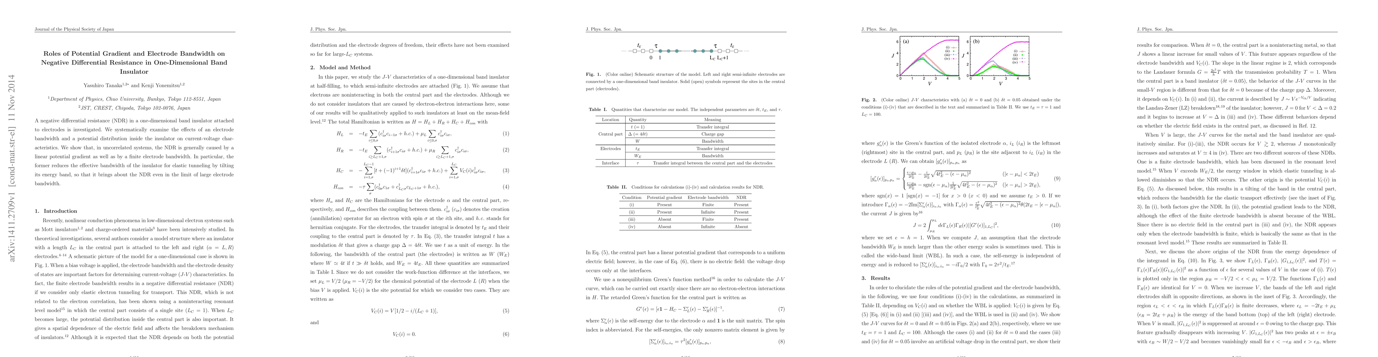 This paper investigates the negative differential resistance (NDR) in a one-dimensional band insulator connected to electrodes, focusing on the roles of potential gradient and electrode bandwidth. The study reveals that NDR is caused by both a linear potential gradient and finite electrode bandwidth, with the gradient tilting the energy band and reducing the effective insulator bandwidth for elastic tunneling.