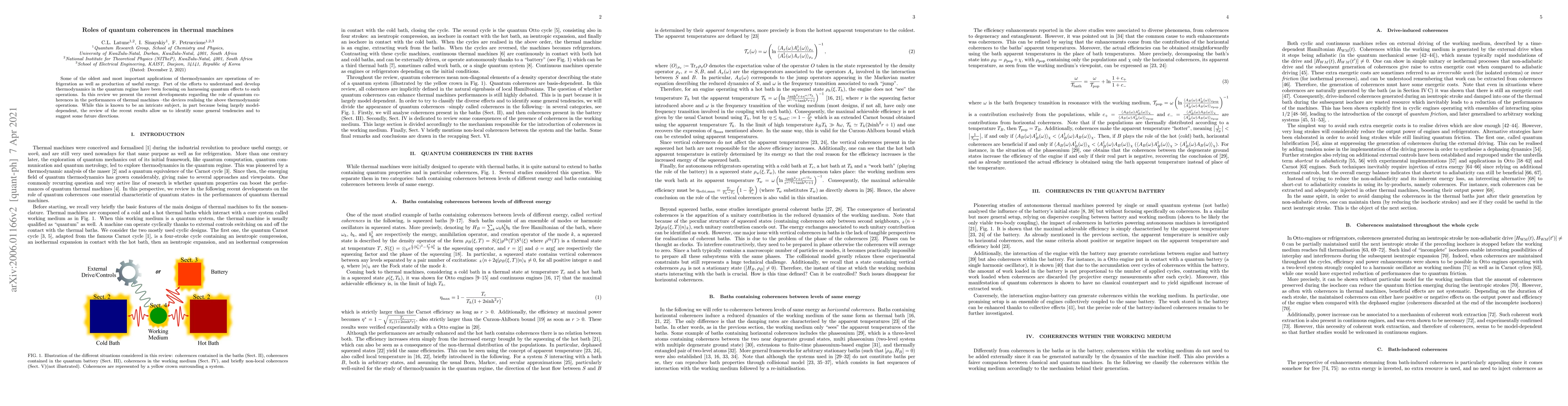 This paper reviews recent advancements in understanding how quantum coherences influence the performance of thermal machines, which perform refrigeration and energy production. Despite the complexity and model dependency, the review identifies general trends and proposes future research directions in harnessing quantum effects for thermodynamic operations.