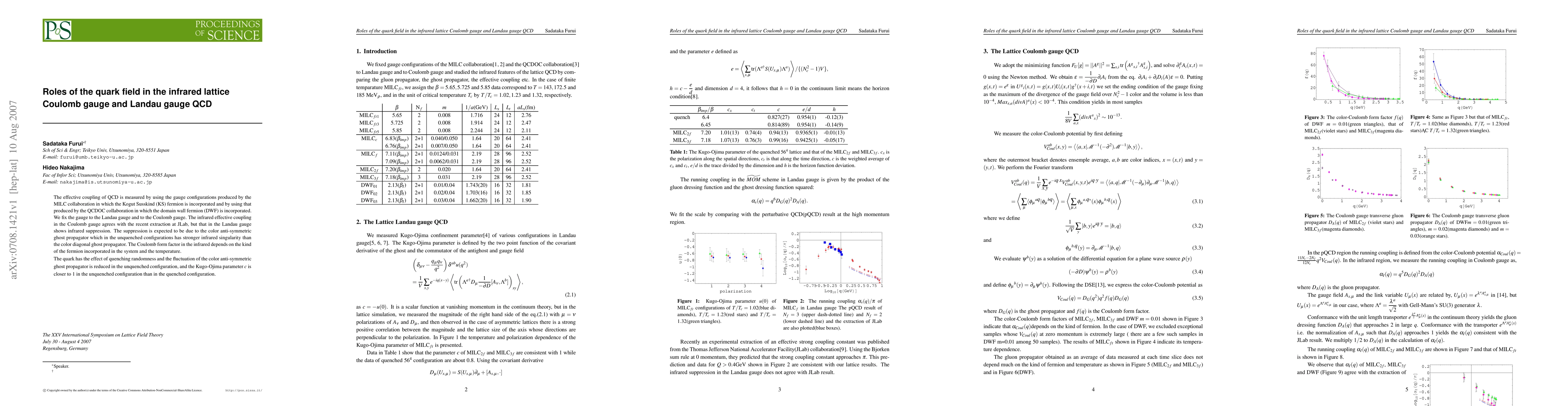 The effective coupling of QCD is measured by using the gauge configurations produced by the MILC collaboration in which the Kogut Susskind (KS) fermion is incorporated and by using that produced by the QCDOC collaboration in which the domain wall fermion (DWF) is incorporated. We fix the gauge to the Landau gauge and to the Coulomb gauge. The infrared effective coupling in the Coulomb gauge agrees with the recent extraction at JLab, but that in the Landau gauge shows infrared suppression. The suppression is expected to be due to the color anti-symmetric ghost propagator which in the unquenched configurations has stronger infrared singularity than the color diagonal ghost propagator. The Coulomb form factor in the infrared depends on the kind of the fermion incorporated in the system and the temperature. The quark has the effect of quenching randomness and the fluctuation of the color anti-symmetric ghost propagator is reduced in the unquenched configuration, and the Kugo-Ojima parameter c is closer to 1 in the unquenched configuration than in the quenched configuration.