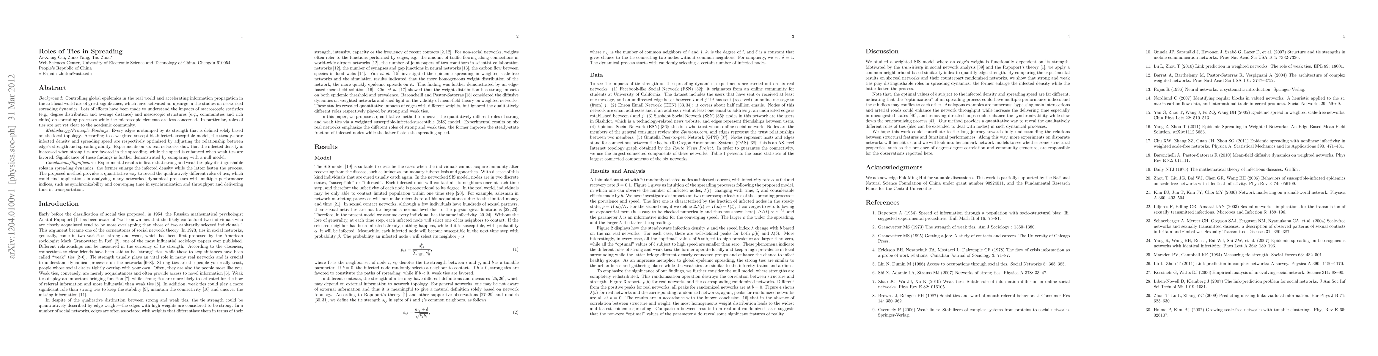 Background: Controlling global epidemics in the real world and accelerating information propagation in the artificial world are of great significance, which have activated an upsurge in the studies on networked spreading dynamics. Lots of efforts have been made to understand the impacts of macroscopic statistics (e.g., degree distribution and average distance) and mesoscopic structures (e.g., communities and rich clubs) on spreading processes while the microscopic elements are less concerned. In particular, roles of ties are not yet clear to the academic community. Methodology/Principle Findings: Every edges is stamped by its strength that is defined solely based on the local topology. According to a weighted susceptible-infected-susceptible model, the steady-state infected density and spreading speed are respectively optimized by adjusting the relationship between edge's strength and spreading ability. Experiments on six real networks show that the infected density is increased when strong ties are favored in the spreading, while the speed is enhanced when weak ties are favored. Significance of these findings is further demonstrated by comparing with a null model. Conclusions/Significance: Experimental results indicate that strong and weak ties play distinguishable roles in spreading dynamics: the former enlarge the infected density while the latter fasten the process. The proposed method provides a quantitative way to reveal the qualitatively different roles of ties, which could find applications in analyzing many networked dynamical processes with multiple performance indices, such as synchronizability and converging time in synchronization and throughput and delivering time in transportation.
