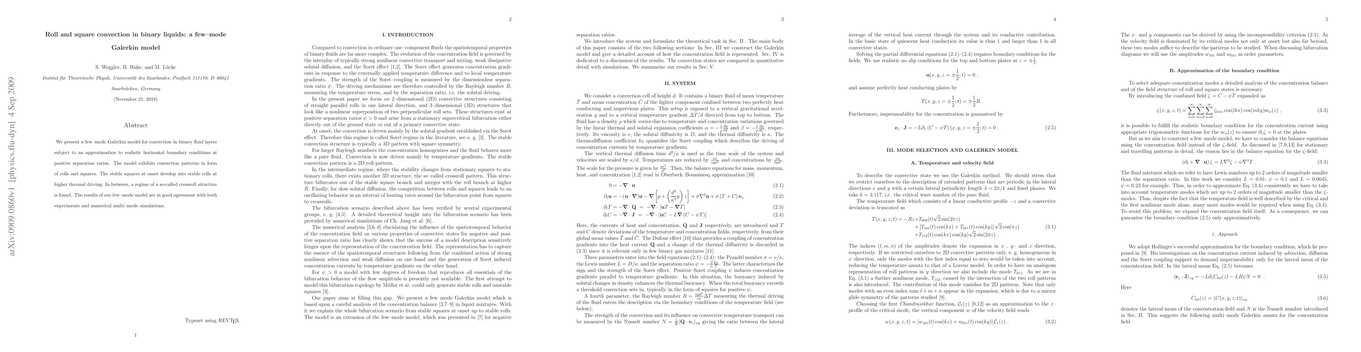 We present a few--mode Galerkin model for convection in binary fluid layers subject to an approximation to realistic horizontal boundary conditions at positive separation ratios. The model exhibits convection patterns in form of rolls and squares. The stable squares at onset develop into stable rolls at higher thermal driving. In between, a regime of a so-called crossroll structure is found. The results of our few--mode model are in good agreement with both experiments and numerical multi--mode simulations.