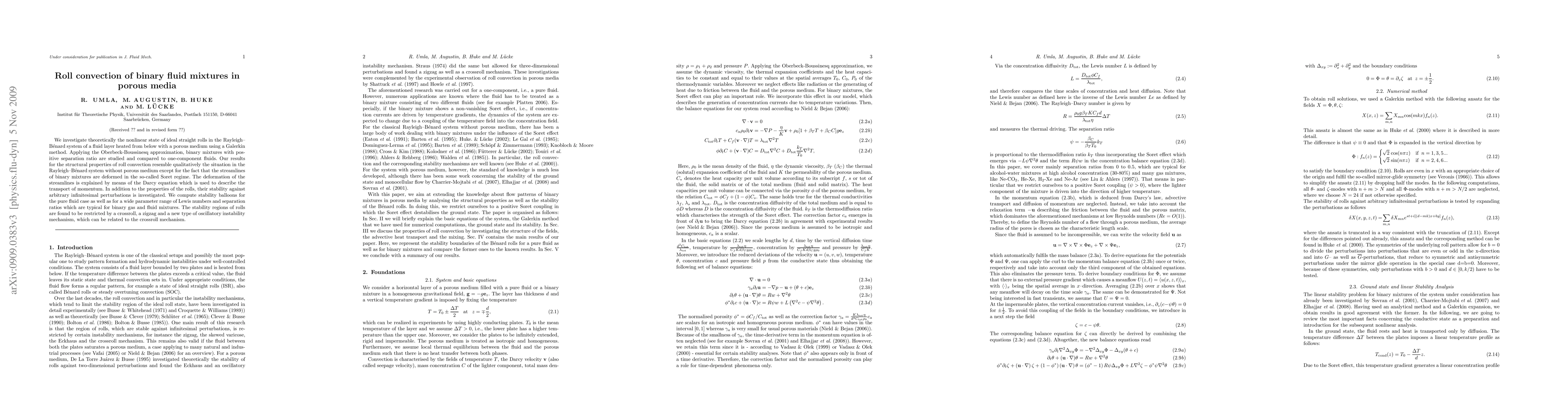 This paper theoretically examines the nonlinear state of roll convection in binary fluid mixtures within porous media, revealing structural deformations in streamlines due to Soret effects. Stability analysis identifies crossroll, zigzag, and a novel oscillatory instability mechanisms, distinct from those in single-component fluids.