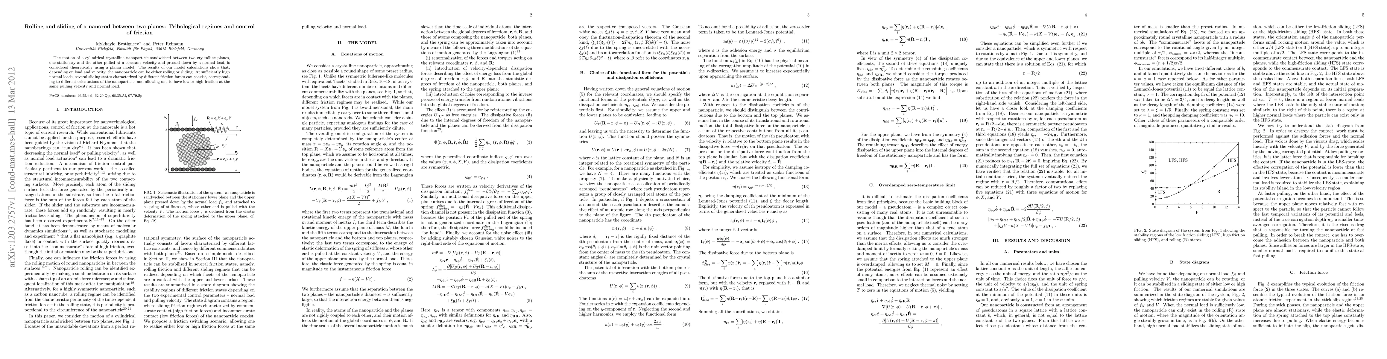 This paper investigates the tribological regimes of a cylindrical nanorod between two crystalline planes, revealing that the nanorod can either roll or slide depending on the load and velocity. It identifies multiple sliding states with varying friction forces, allowing control over friction through nanoparticle orientation.