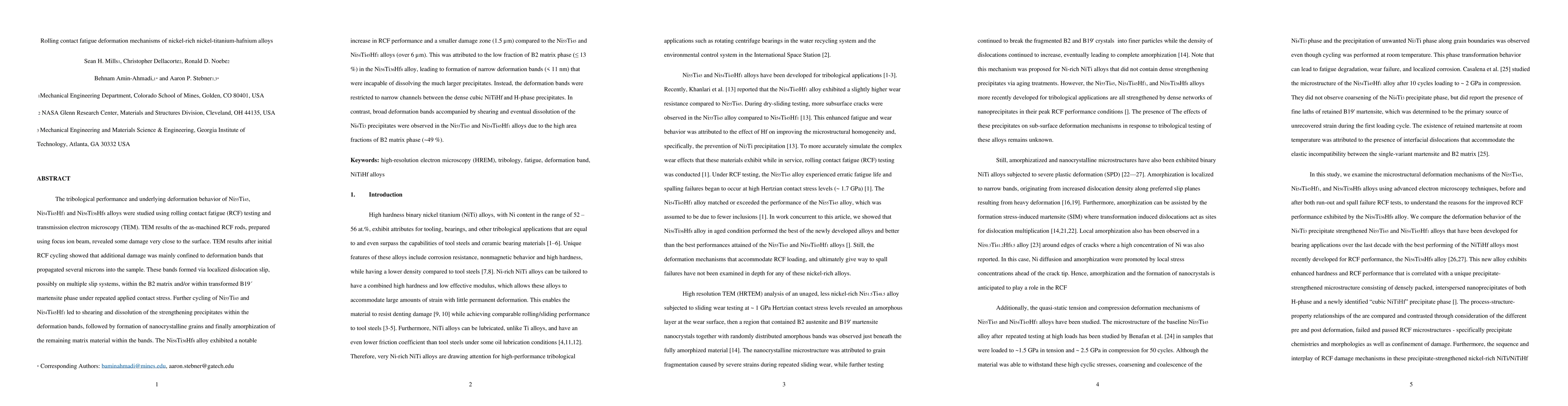 The tribological performance and underlying deformation behavior of Ni55Ti45, Ni54Ti45Hf1 and Ni56Ti36Hf8 alloys were studied using rolling contact fatigue (RCF) testing and transmission electron microscopy (TEM). TEM results of the as-machined RCF rods, prepared using focus ion beam, revealed some damage very close to the surface. TEM results after initial RCF cycling showed that additional damage was mainly confined to deformation bands that propagated several microns into the sample. These bands formed via localized dislocation slip, possibly on multiple slip systems, within the B2 matrix and/or within transformed B19 prime martensite phase under repeated applied contact stress. Further cycling of Ni55Ti45 and Ni54Ti45Hf1 led to shearing and dissolution of the strengthening precipitates within the deformation bands, followed by formation of nanocrystalline grains and finally amorphization of the remaining matrix material within the bands. The Ni56Ti36Hf8 alloy exhibited a notable increase in RCF performance and a smaller damage zone (1.5 microns) compared to the Ni55Ti45 and Ni54Ti45Hf1 alloys (over 6 microns). This was attributed to the low fraction of B2 matrix phase (less than or equal to 13 %) in the Ni56Ti36Hf8 alloy, leading to formation of narrow deformation bands (less than 11 nm) that were incapable of dissolving the much larger precipitates. Instead, the deformation bands were restricted to narrow channels between the dense cubic NiTiHf and H-phase precipitates. In contrast, broad deformation bands accompanied by shearing and eventual dissolution of the Ni4Ti3 precipitates were observed in the Ni55Ti45 and Ni54Ti45Hf1 alloys due to the high area fractions of B2 matrix phase (~49 %).