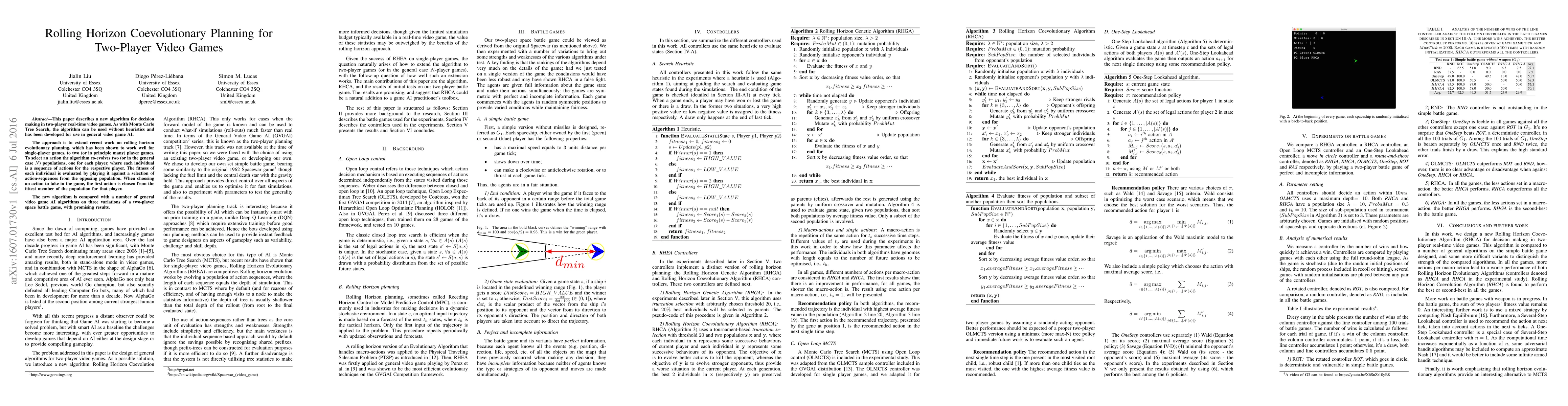 This paper introduces a rolling horizon coevolutionary planning algorithm for decision-making in two-player real-time video games, extending single-player evolutionary planning to multiplayer scenarios. The algorithm co-evolves populations for each player, selecting actions based on the fittest sequences, and shows promising results against other AI algorithms in a two-player space battle game.