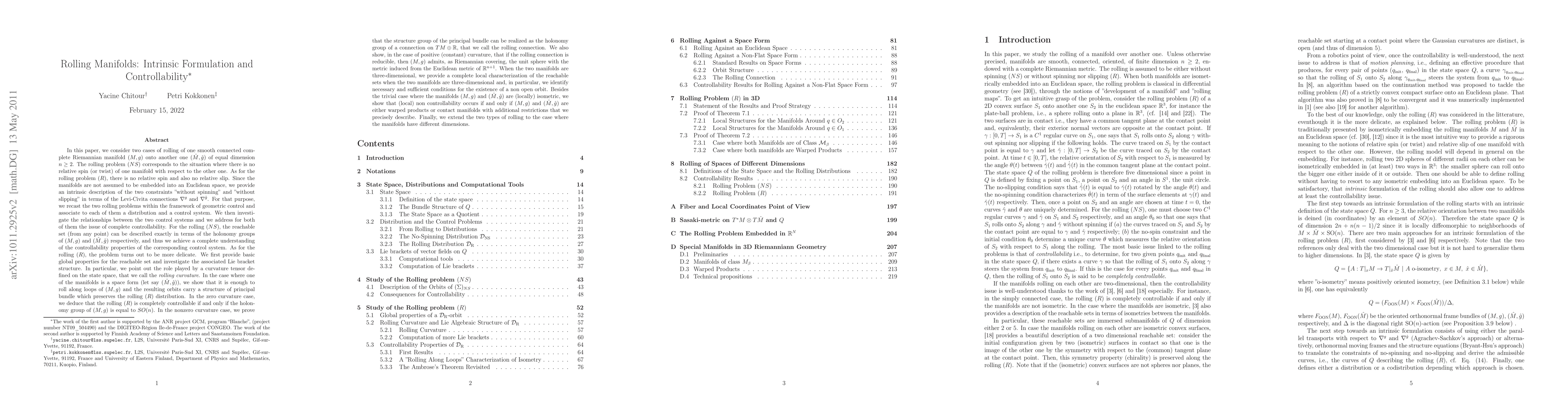 In this paper, we consider two cases of rolling of one smooth connected complete Riemannian manifold $(M,g)$ onto another one $(\hM,\hg)$ of equal dimension $n\geq 2$. The rolling problem $(NS)$ corresponds to the situation where there is no relative spin (or twist) of one manifold with respect to the other one. As for the rolling problem $(R)$, there is no relative spin and also no relative slip. Since the manifolds are not assumed to be embedded into an Euclidean space, we provide an intrinsic description of the two constraints "without spinning" and "without slipping" in terms of the Levi-Civita connections $\nabla^{g}$ and $\nabla^{\hg}$. For that purpose, we recast the two rolling problems within the framework of geometric control and associate to each of them a distribution and a control system. We then investigate the relationships between the two control systems and we address for both of them the issue of complete controllability. For the rolling $(NS)$, the reachable set (from any point) can be described exactly in terms of the holonomy groups of $(M,g)$ and $(\hM,\hg)$ respectively, and thus we achieve a complete understanding of the controllability properties of the corresponding control system. As for the rolling $(R)$, the problem turns out to be more delicate. We first provide basic global properties for the reachable set and investigate the associated Lie bracket structure. In particular, we point out the role played by a curvature tensor defined on the state space, that we call the \emph{rolling curvature}. In the case where one of the manifolds is a space form (let say $(\hM,\hg)$), we show that it is enough to roll along loops of $(M,g)$ and the resulting orbits carry a structure of principal bundle which preserves the rolling $(R)$ distribution. In the zero curvature case, we deduce that the rolling $(R)$ is completely controllable if and only if the holonomy group of $(M,g)$ is equal to SO(n). In the nonzero curvature case, we prove that the structure group of the principal bundle can be realized as the holonomy group of a connection on $TM\oplus \R$, that we call the rolling connection. We also show, in the case of positive (constant) curvature, that if the rolling connection is reducible, then $(M,g)$ admits, as Riemannian covering, the unit sphere with the metric induced from the Euclidean metric of $\R^{n+1}$. When the two manifolds are three-dimensional, we provide a complete local characterization of the reachable sets when the two manifolds are three-dimensional and, in particular, we identify necessary and sufficient conditions for the existence of a non open orbit. Besides the trivial case where the manifolds $(M,g)$ and $(\hM,\hg)$ are (locally) isometric, we show that (local) non controllability occurs if and only if $(M,g)$ and $(\hM,\hg)$ are either warped products or contact manifolds with additional restrictions that we precisely describe. Finally, we extend the two types of rolling to the case where the manifolds have different dimensions.