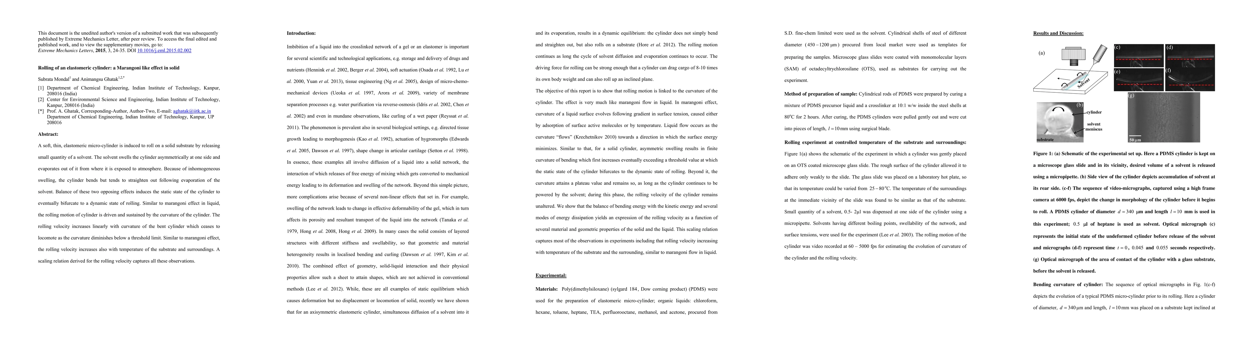 A soft, thin, elastomeric micro-cylinder is induced to roll on a solid substrate by releasing small quantity of a solvent. The solvent swells the cylinder asymmetrically at one side and evaporates out of it from where it is exposed to atmosphere. Because of inhomogeneous swelling, the cylinder bends but tends to straighten out following evaporation of the solvent. Balance of these two opposing effects induces the static state of the cylinder to eventually bifurcate to a dynamic state of rolling. Similar to marangoni effect in liquid, the rolling motion of cylinder is driven and sustained by the curvature of the cylinder. The rolling velocity increases linearly with curvature of the bent cylinder which ceases to locomote as the curvature diminishes below a threshold limit. Similar to marangoni effect, the rolling velocity increases also with temperature of the substrate and surroundings. A scaling relation derived for the rolling velocity captures all these observations.