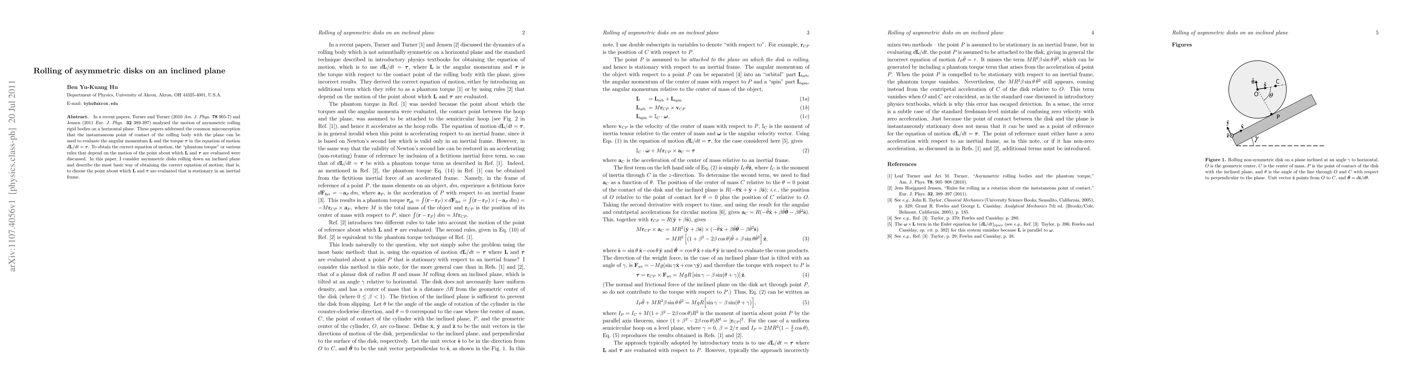 This paper examines the rolling motion of asymmetric disks on an inclined plane, addressing the misconception regarding the evaluation of angular momentum and torque. It proposes a straightforward method to derive the correct equation of motion by selecting a stationary point in an inertial frame.