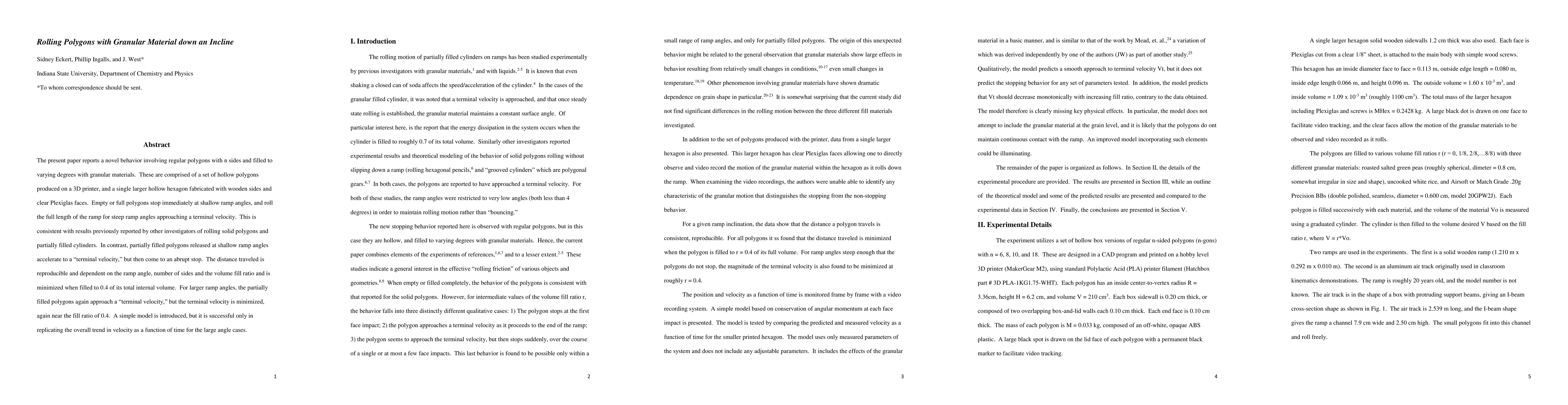 The present paper reports a novel behavior involving regular polygons with n sides and filled to varying degrees with granular materials. These are comprised of a set of hollow polygons produced on a 3D printer, and a single larger hollow hexagon fabricated with wooden sides and clear Plexiglas faces. Empty or full polygons stop immediately at shallow ramp angles, and roll the full length of the ramp for steep ramp angles, approaching a terminal velocity. This is consistent with results previously reported by other investigators of rolling solid polygons and partially filled cylinders. In contrast, partially filled polygons released at shallow ramp angles accelerate to a "terminal velocity," but then come to an abrupt stop. The distance traveled is reproducible and dependent on the ramp angle, number of sides and the volume fill ratio and is minimized when filled to 0.4 of its total internal volume. For larger ramp angles, the partially filled polygons again approach a "terminal velocity," but the terminal velocity is minimized, again near the fill ratio of 0.4. a simple model is introduced, but it is successful only in replicating the overall trend in velocity as a function of time for the large angle cases.