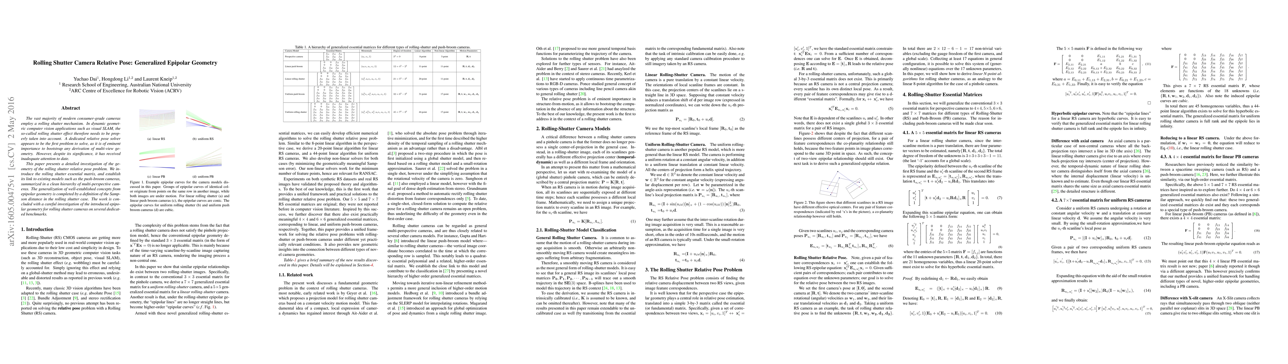 This paper investigates the geometry of rolling shutter cameras for relative pose estimation, introducing the rolling shutter essential matrix and establishing its link to existing models. It also generalizes epipolar geometry concepts and evaluates the proposed methods on benchmarks.