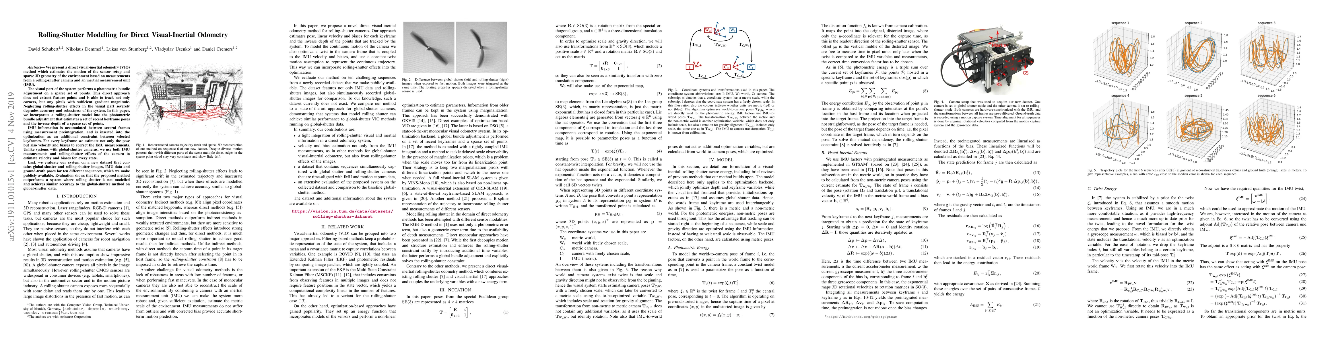 This paper presents a direct visual-inertial odometry method that integrates a rolling-shutter model into photometric bundle adjustment to accurately estimate motion and sparse 3D geometry using a rolling-shutter camera and IMU, outperforming systems that neglect rolling-shutter effects. The system also corrects IMU measurements using estimated velocity and biases.