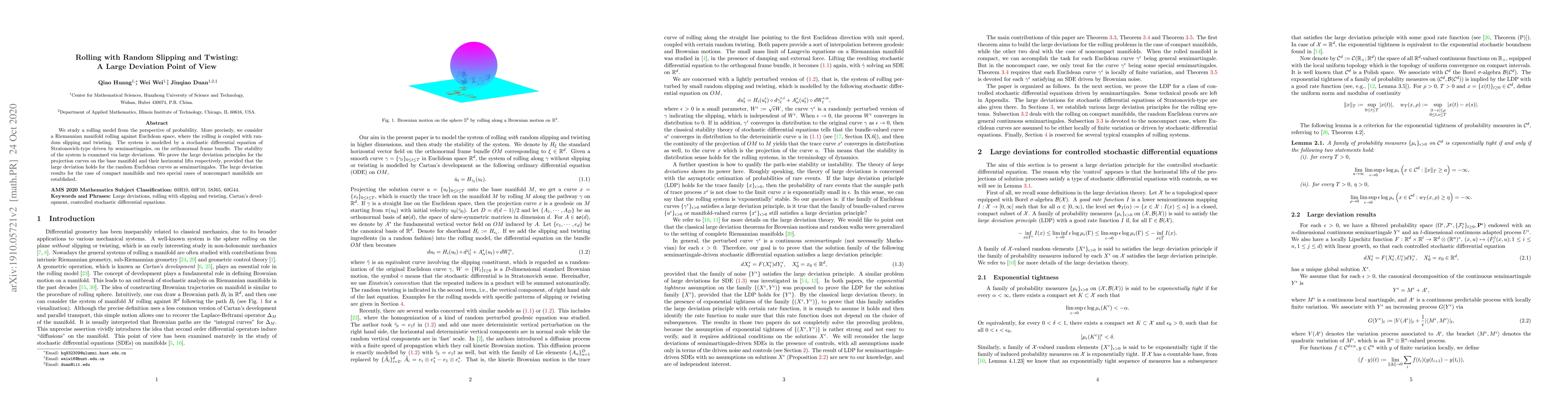 We study a rolling model from the perspective of probability. More precisely, we consider a Riemannian manifold rolling against Euclidean space, where the rolling is coupled with random slipping and twisting. The system is modelled by a stochastic differential equation of Stratonovich-type driven by semimartingales, on the orthonormal frame bundle. The stability of the system is examined via large deviations. We prove the large deviation principles for the projection curves on the base manifold and their horizontal lifts respectively, provided that the large deviation holds for the random Euclidean curves as semimartingales. The large deviation results for the case of compact manifolds and two special cases of noncompact manifolds are established.
