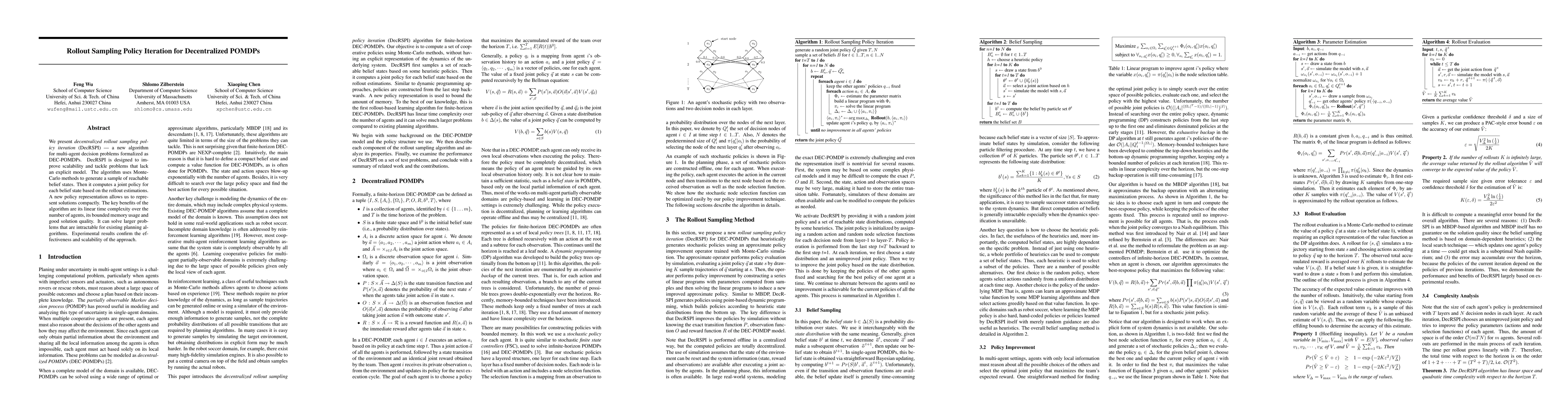 The DecRSPI algorithm introduces a scalable method for solving decentralized POMDPs using rollout sampling and policy iteration, achieving linear time complexity and bounded memory usage while maintaining solution quality. Experimental results demonstrate its effectiveness in handling larger, model-free multi-agent decision problems.