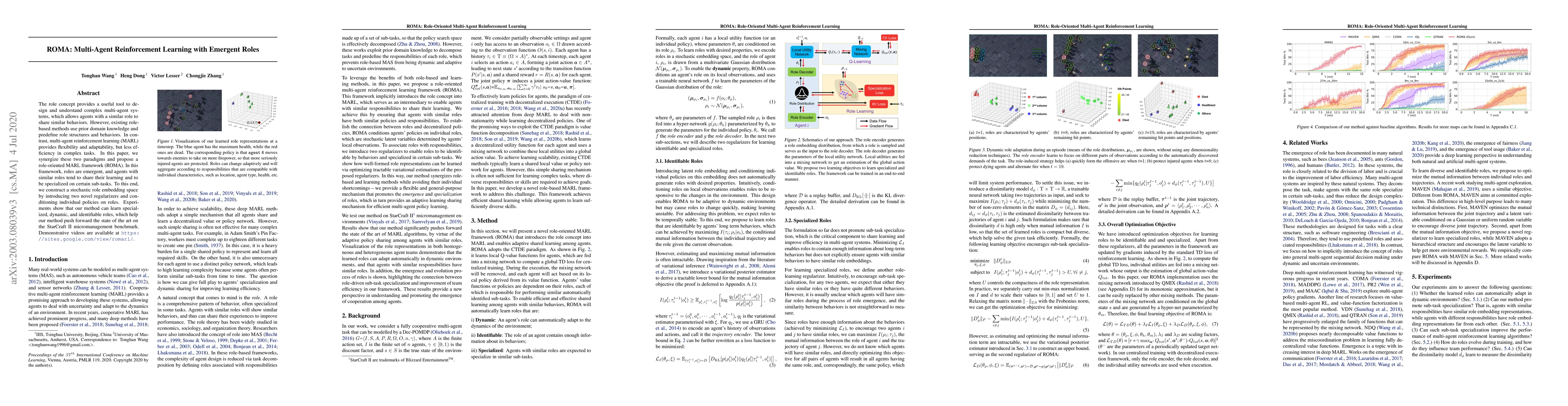 ROMA introduces a novel multi-agent reinforcement learning framework where roles emerge dynamically, enabling agents to share learning and specialize in sub-tasks. This approach enhances efficiency and adaptability in complex tasks, demonstrated through state-of-the-art performance on StarCraft II micromanagement.