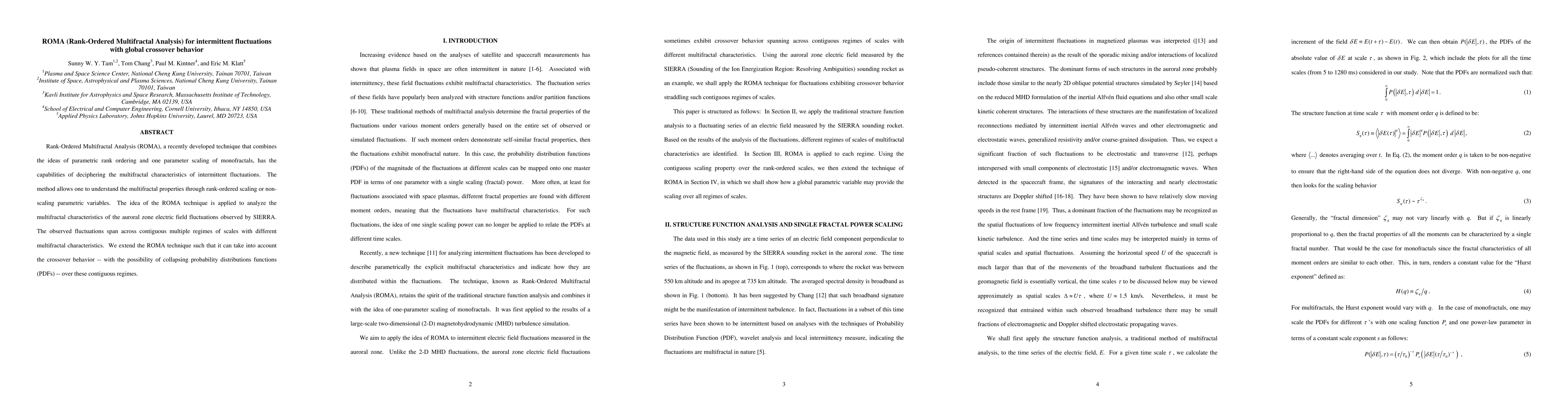 Rank-Ordered Multifractal Analysis (ROMA), a recently developed technique that combines the ideas of parametric rank ordering and one parameter scaling of monofractals, has the capabilities of deciphering the multifractal characteristics of intermittent fluctuations. The method allows one to understand the multifractal properties through rank-ordered scaling or non-scaling parametric variables. The idea of the ROMA technique is applied to analyze the multifractal characteristics of the auroral zone electric field fluctuations observed by SIERRA. The observed fluctuations span across contiguous multiple regimes of scales with different multifractal characteristics. We extend the ROMA technique such that it can take into account the crossover behavior -- with the possibility of collapsing probability distributions functions (PDFs) -- over these contiguous regimes.