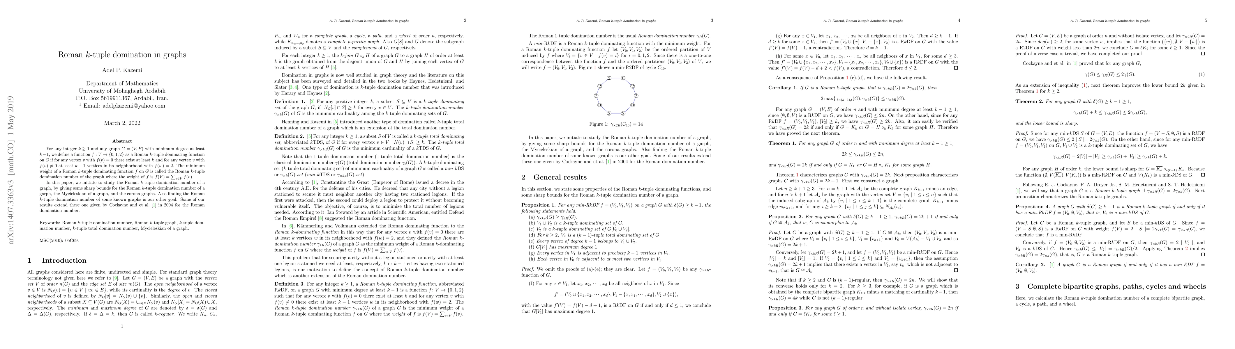 For any integer $k\geq 1$ and any graph $G=(V,E)$ with minimum degree at least $k-1$, we define a function $f:V\rightarrow \{0,1,2\}$ as a Roman $k$-tuple dominating function on $G$ if for any vertex $v$ with $f(v)=0$ there exist at least $k$ and for any vertex $v$ with $f(v)\neq 0$ at least $k-1$ vertices in its neighborhood with $f(w)=2$. The minimum weight of a Roman $k$-tuple dominating function $f$ on $G$ is called the Roman $k$-tuple domination number of the graph where the weight of $f$ is $f(V)=\sum_{v\in V}f(v)$. In this paper, we initiate to study the Roman $k$-tuple domination number of a graph, by giving some sharp bounds for the Roman $k$-tuple domination number of a garph, the Mycieleskian of a graph, and the corona graphs. Also finding the Roman $k$-tuple domination number of some known graphs is our other goal. Some of our results extend these one given by Cockayne and et al.} in 2004 for the Roman domination number.