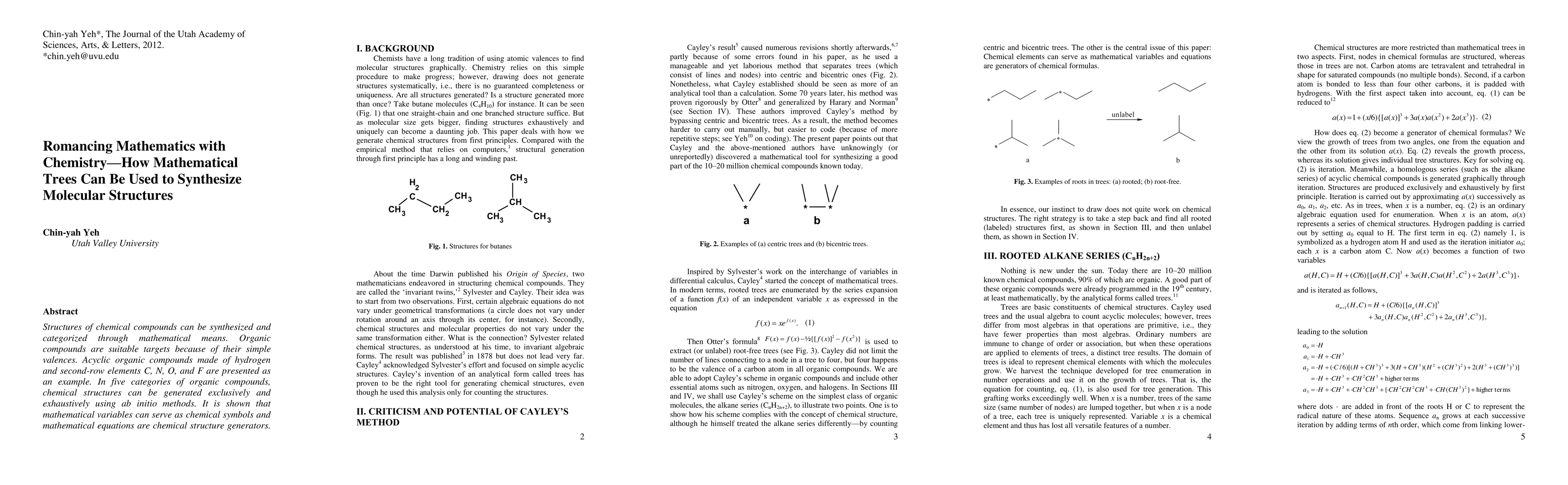 This research demonstrates the use of mathematical trees to synthesize and categorize organic compound structures, specifically acyclic ones with hydrogen and second-row elements. It shows that mathematical variables can represent chemical symbols and equations can generate these structures exhaustively using ab initio methods.