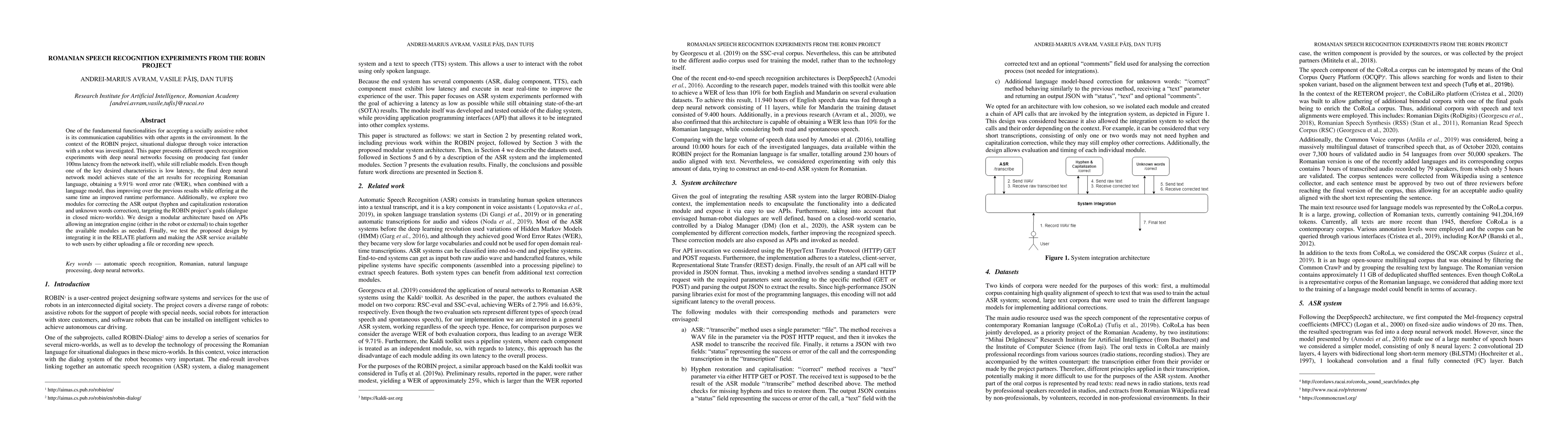 One of the fundamental functionalities for accepting a socially assistive robot is its communication capabilities with other agents in the environment. In the context of the ROBIN project, situational dialogue through voice interaction with a robot was investigated. This paper presents different speech recognition experiments with deep neural networks focusing on producing fast (under 100ms latency from the network itself), while still reliable models. Even though one of the key desired characteristics is low latency, the final deep neural network model achieves state of the art results for recognizing Romanian language, obtaining a 9.91% word error rate (WER), when combined with a language model, thus improving over the previous results while offering at the same time an improved runtime performance. Additionally, we explore two modules for correcting the ASR output (hyphen and capitalization restoration and unknown words correction), targeting the ROBIN project's goals (dialogue in closed micro-worlds). We design a modular architecture based on APIs allowing an integration engine (either in the robot or external) to chain together the available modules as needed. Finally, we test the proposed design by integrating it in the RELATE platform and making the ASR service available to web users by either uploading a file or recording new speech.
