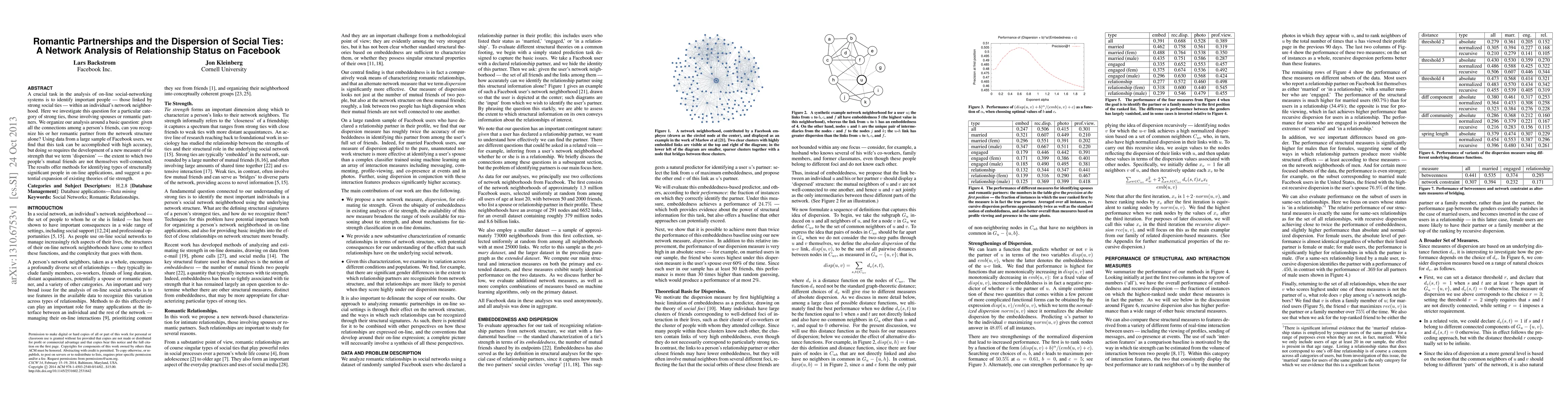 This study examines how the network structure on Facebook can reveal romantic partnerships by developing a new measure termed "dispersion," which indicates the degree to which mutual friends of two individuals are not well-connected. The research finds high accuracy in identifying romantic partners based on network data, suggesting new insights into social tie strength.