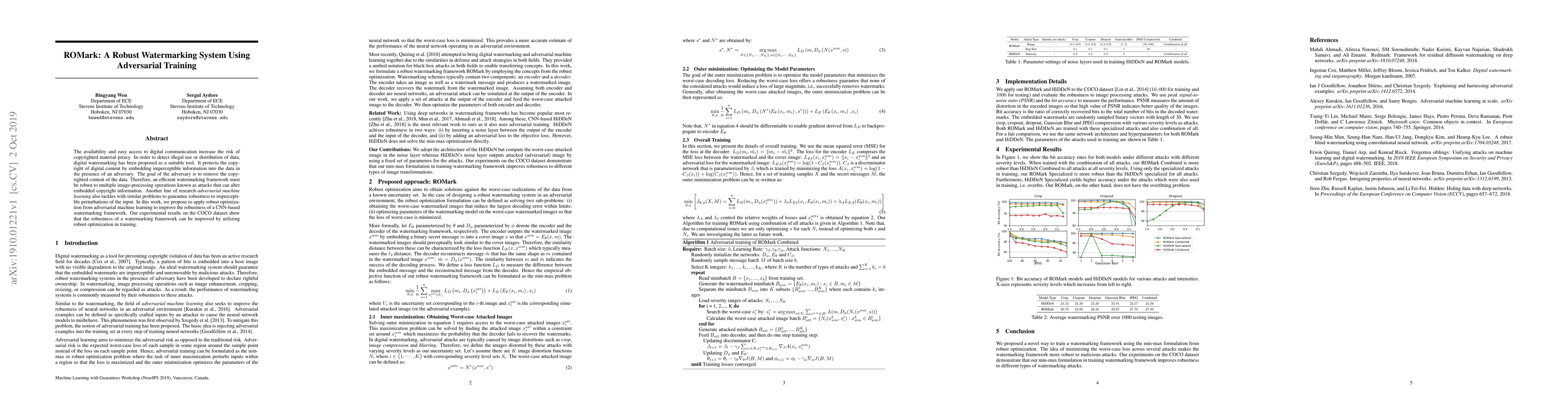 Title: ROMark: A Robust Watermarking System Using Adversarial Training Summary: This paper proposes a CNN-based watermarking system enhanced by adversarial training to improve robustness against various image-processing attacks, demonstrating improved performance on the COCO dataset.