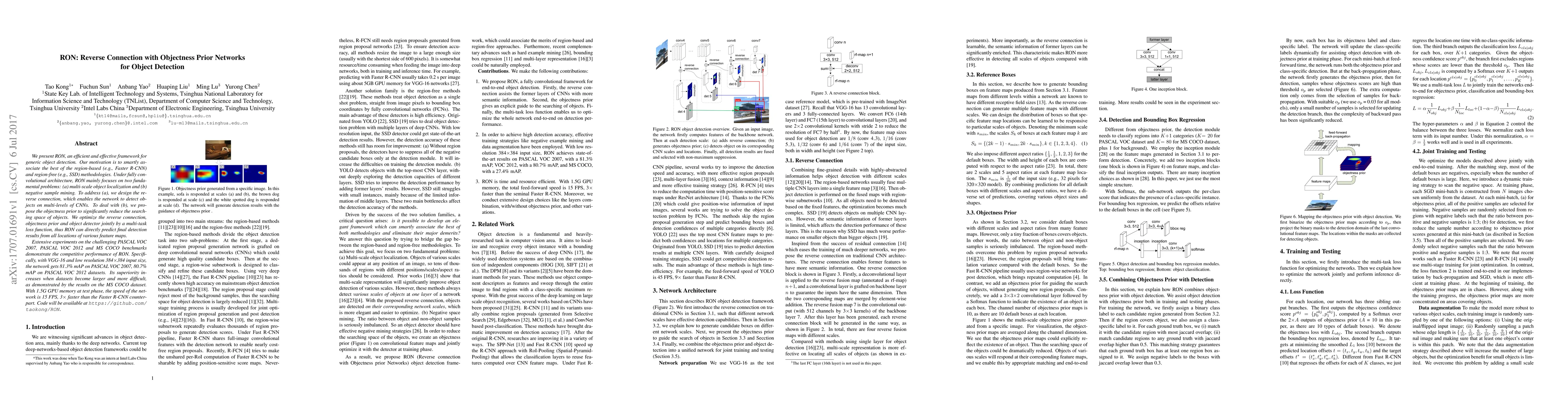 This research paper introduces RON, a novel framework for object detection that combines the strengths of region-based and region-free methodologies. The framework addresses multi-scale object localization and negative sample mining through a reverse connection and objectness prior, respectively. The proposed approach demonstrates competitive performance on several benchmarks, achieving high mAP scores and significantly faster speeds compared to existing methods.