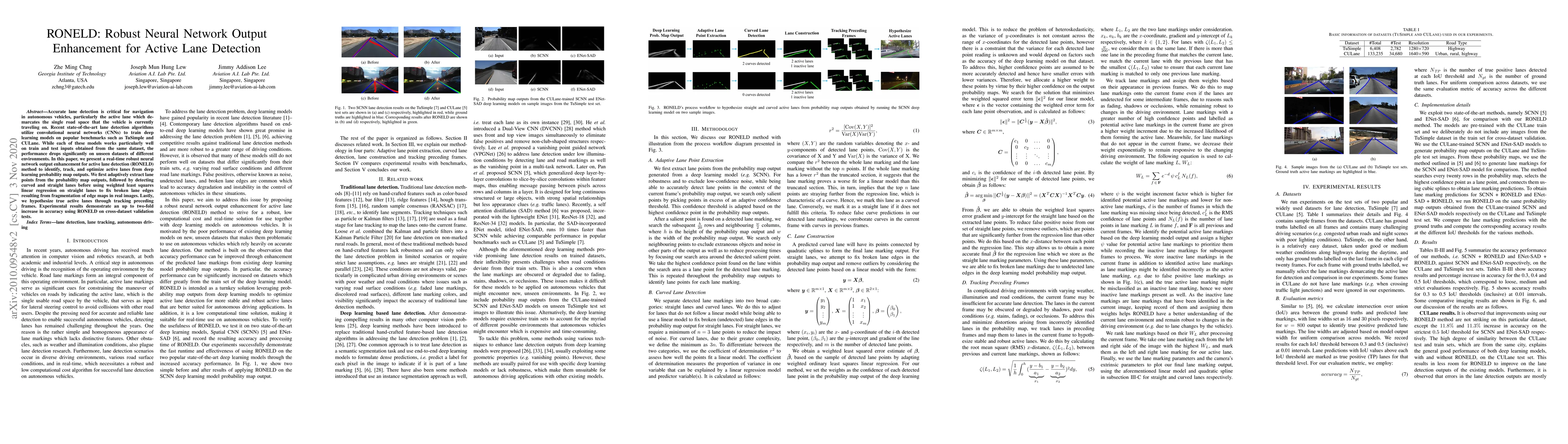 RONELD enhances active lane detection in autonomous vehicles by adaptively extracting lane points and optimizing straight lanes using weighted least squares linear regression, leading to a significant increase in accuracy across different datasets. Experimental results show a two-fold improvement in cross-dataset validation tests.