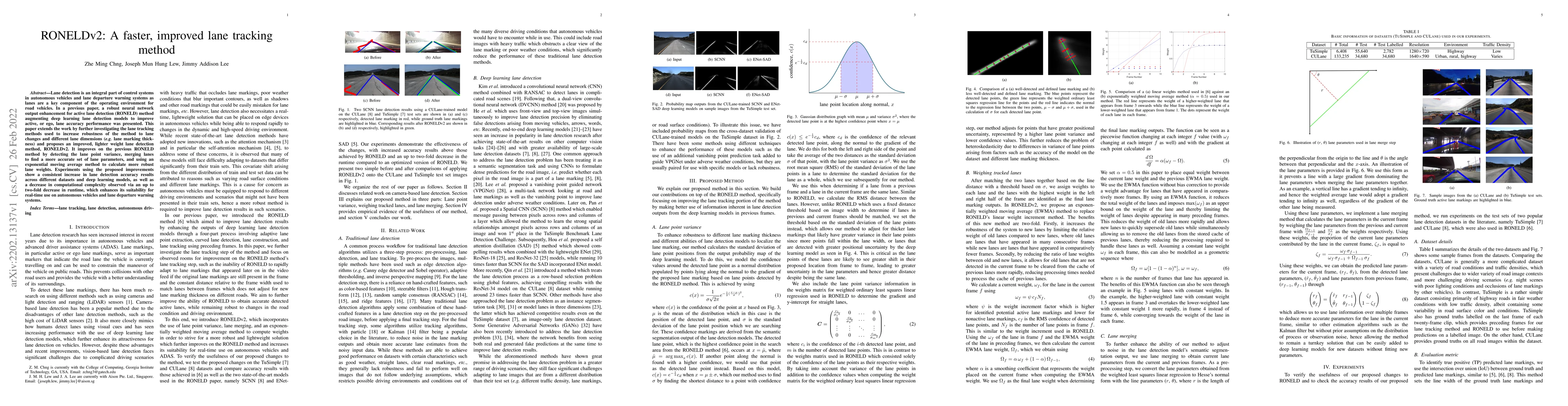 RONELDv2 enhances lane detection accuracy and efficiency for autonomous vehicles by improving lane tracking methods, resulting in a two-fold reduction in runtime and consistent accuracy across various datasets.
