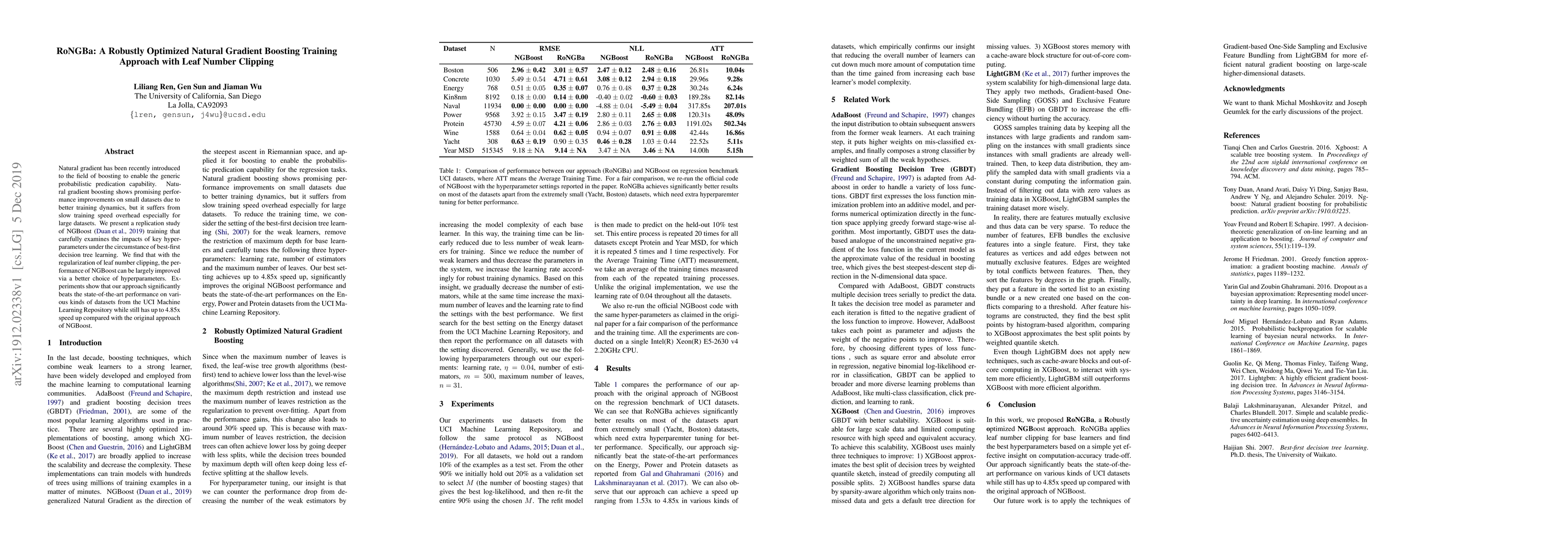 This paper introduces RoNGBa, an optimized natural gradient boosting method with leaf number clipping, which enhances performance on small datasets and improves training speed for large datasets. The study demonstrates significant performance gains and up to 4.85x speed improvements compared to the original NGBoost approach.