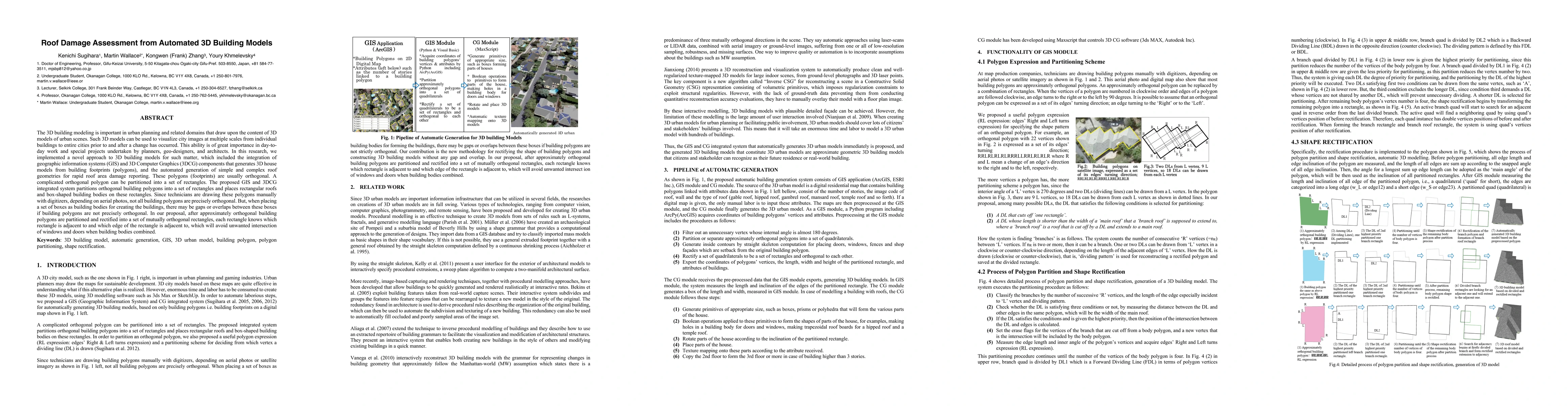 The 3D building modelling is important in urban planning and related domains that draw upon the content of 3D models of urban scenes. Such 3D models can be used to visualize city images at multiple scales from individual buildings to entire cities prior to and after a change has occurred. This ability is of great importance in day-to-day work and special projects undertaken by planners, geo-designers, and architects. In this research, we implemented a novel approach to 3D building models for such matter, which included the integration of geographic information systems (GIS) and 3D Computer Graphics (3DCG) components that generate 3D house models from building footprints (polygons), and the automated generation of simple and complex roof geometries for rapid roof area damage reporting. These polygons (footprints) are usually orthogonal. A complicated orthogonal polygon can be partitioned into a set of rectangles. The proposed GIS and 3DCG integrated system partitions orthogonal building polygons into a set of rectangles and places rectangular roofs and box-shaped building bodies on these rectangles. Since technicians are drawing these polygons manually with digitizers, depending on aerial photos, not all building polygons are precisely orthogonal. But, when placing a set of boxes as building bodies for creating the buildings, there may be gaps or overlaps between these boxes if building polygons are not precisely orthogonal. In our proposal, after approximately orthogonal building polygons are partitioned and rectified into a set of mutually orthogonal rectangles, each rectangle knows which rectangle is adjacent to and which edge of the rectangle is adjacent to, which will avoid unwanted intersection of windows and doors when building bodies combined.