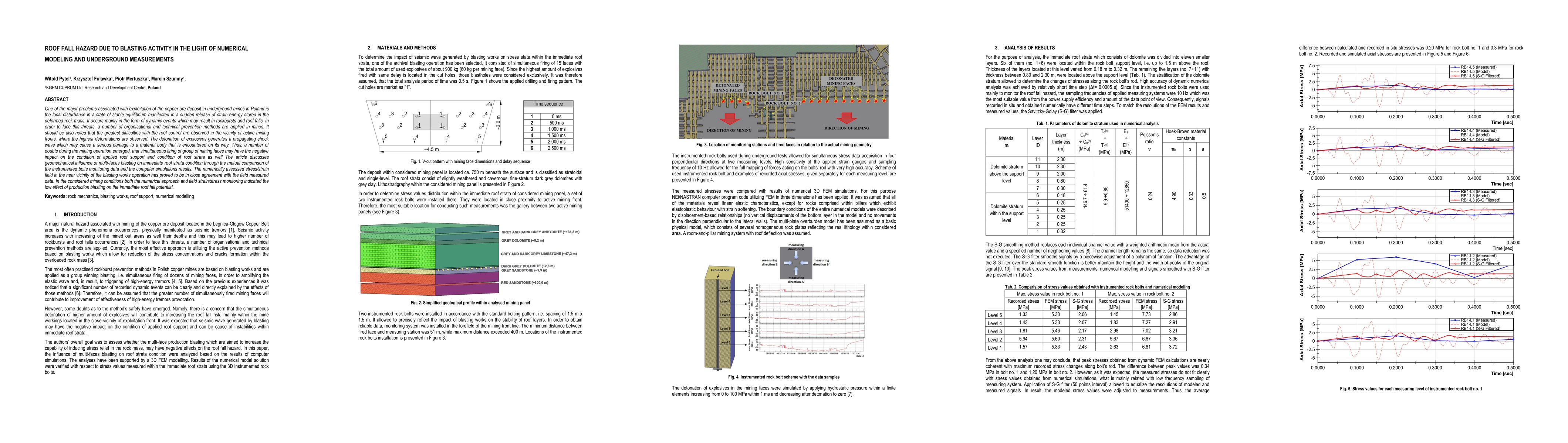 One of the major problems associated with exploitation of the copper ore deposit in underground mines in Poland is the local disturbance in a state of stable equilibrium manifested in a sudden release of strain energy stored in the deformed rock mass. It occurs mainly in the form of dynamic events which may result in rockbursts and roof falls. In order to face this threats, a number of organisational and technical prevention methods are applied in mines. It should be also noted that the greatest difficulties with the roof control are observed in the vicinity of active mining fronts, where the highest deformations are observed. The detonation of explosives generates a propagating shock wave which may cause a serious damage to a material body that is encountered on its way. Thus, a number of doubts during the mining operation emerged, that simultaneous firing of group of mining faces may have the negative impact on the condition of applied roof support and condition of roof strata as well The article discusses geomechanical influence of multi-faces blasting on immediate roof strata condition through the mutual comparison of the instrumented bolts monitoring data and the computer simulations results. The numerically assessed stress/strain field in the near vicinity of the blasting works operation has proved to be in close agreement with the field measured data. In the considered mining conditions both the numerical approach and field strain/stress monitoring indicated the low effect of production blasting on the immediate roof fall potential.