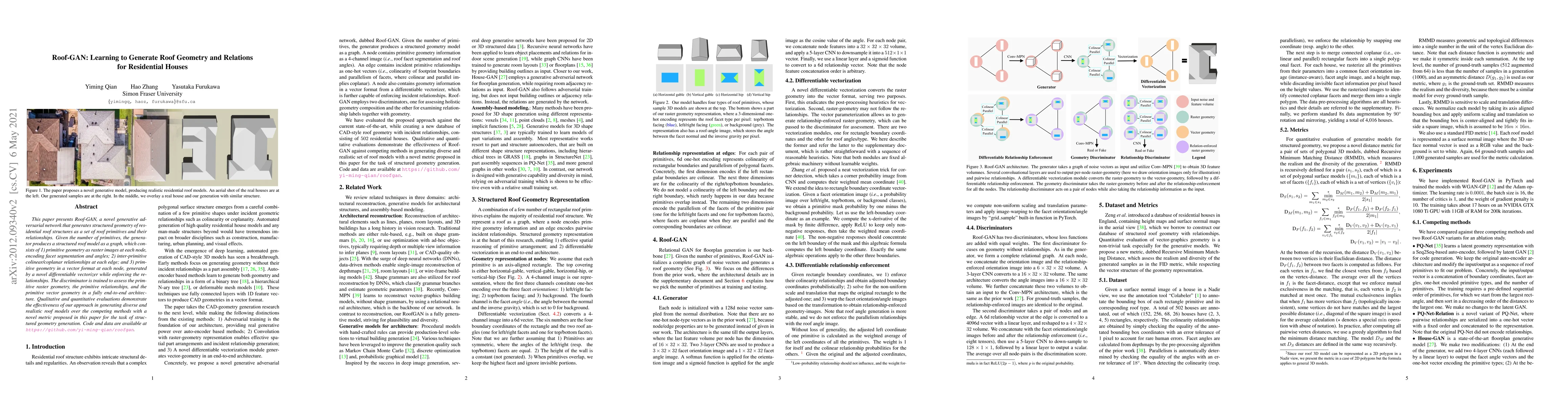 Roof-GAN is a generative adversarial network that creates realistic structured roof geometry for residential houses by generating roof primitives and their relationships. The model produces diverse and accurate roof models, evaluated both qualitatively and quantitatively against competing methods.