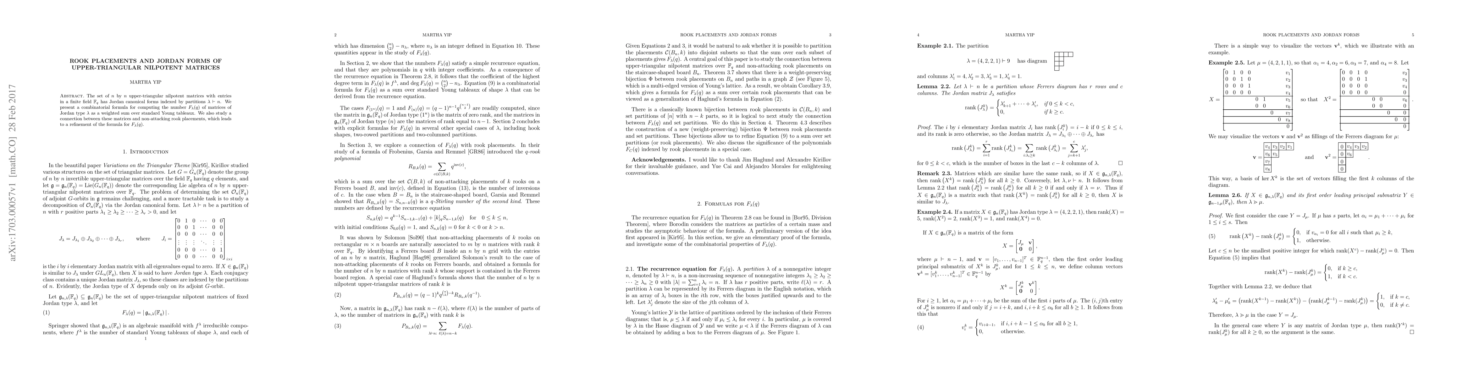 The paper provides a combinatorial formula for the number of n by n upper-triangular nilpotent matrices over a finite field F_q with a given Jordan canonical form, indexed by partitions λ of n. It establishes a connection between these matrices and non-attacking rook placements, refining the formula.