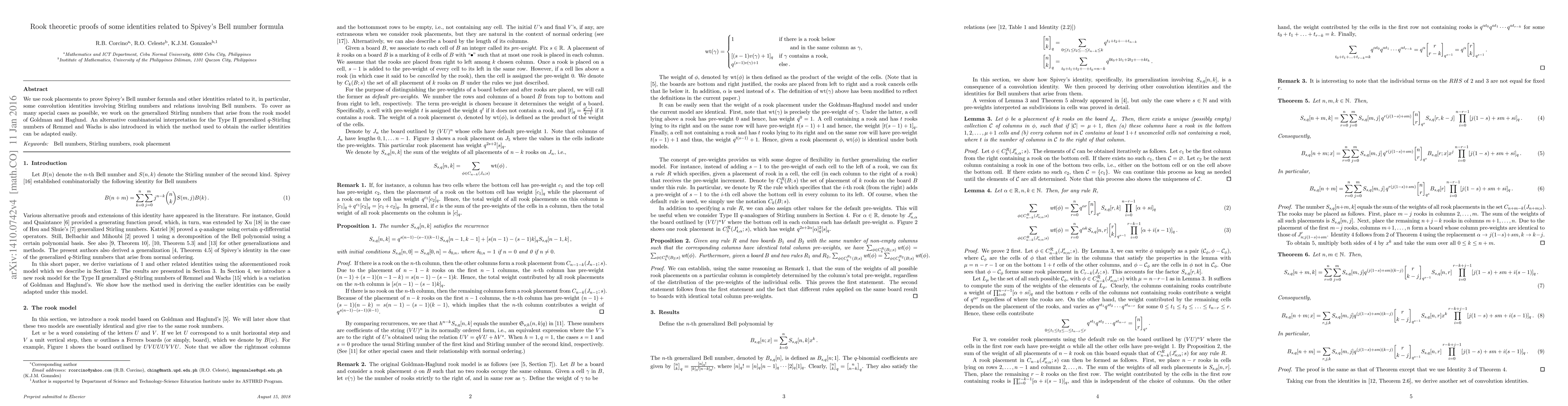 Researchers used rook placements to prove a combinatorial formula related to Spivey's Bell numbers, establishing new identities involving Stirling numbers and generalized q-Stirling numbers.
