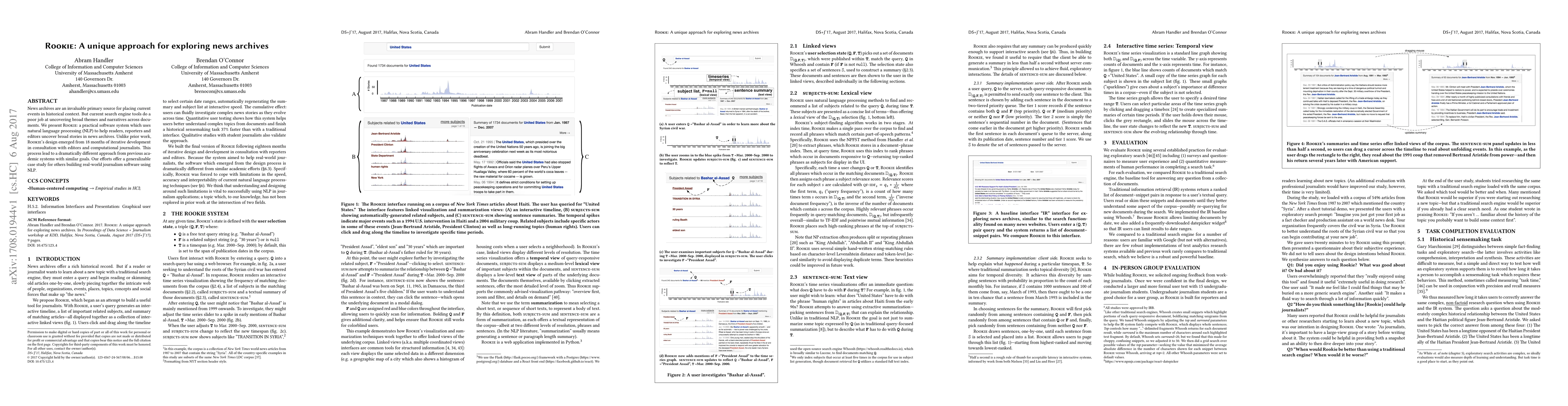 Rookie introduces a novel approach to exploratory search in news archives using linked temporal and text views, leveraging NLP for subject and sentence summarization.