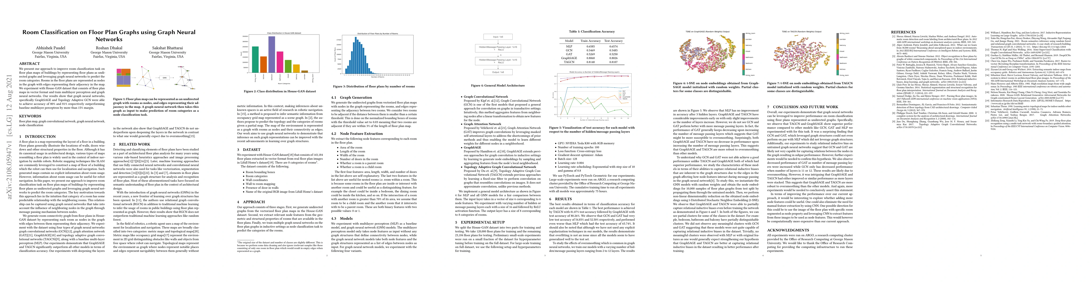 This paper proposes using graph neural networks to classify rooms in floor plan graphs, achieving 80% accuracy with GraphSAGE and 81% with Topology Adaptive GCN, outperforming multilayer perceptrons by over 15%. The floor plan maps are represented as undirected graphs with nodes for rooms and edges for adjacency.