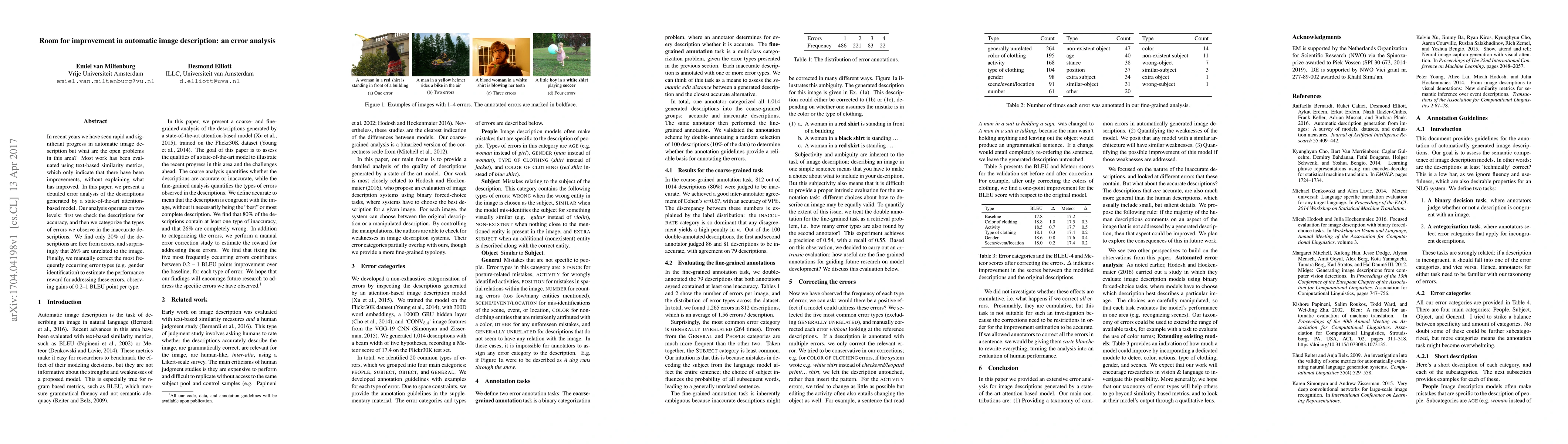A study found that 80% of automatic image descriptions contain errors, with 26% being unrelated to the image. Correcting these errors can lead to significant improvements in performance, with gains of up to 1 BLEU point per type.