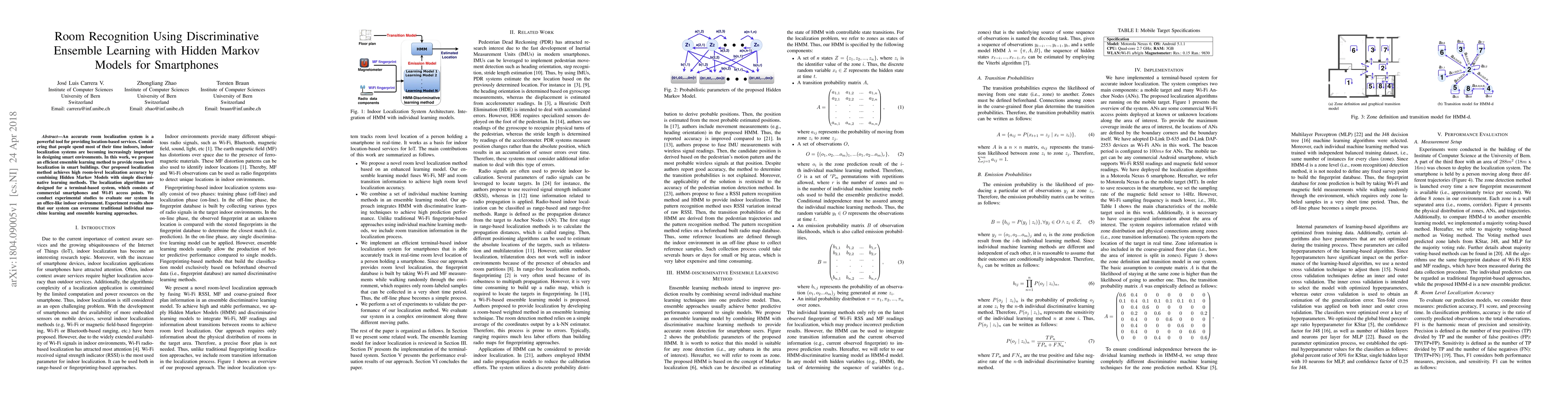 This paper proposes an ensemble learning method combining Hidden Markov Models with discriminative learning for smartphone-based room localization in smart buildings, achieving high accuracy. Experimental results demonstrate superior performance over traditional machine learning and ensemble learning approaches in an office-like indoor environment.