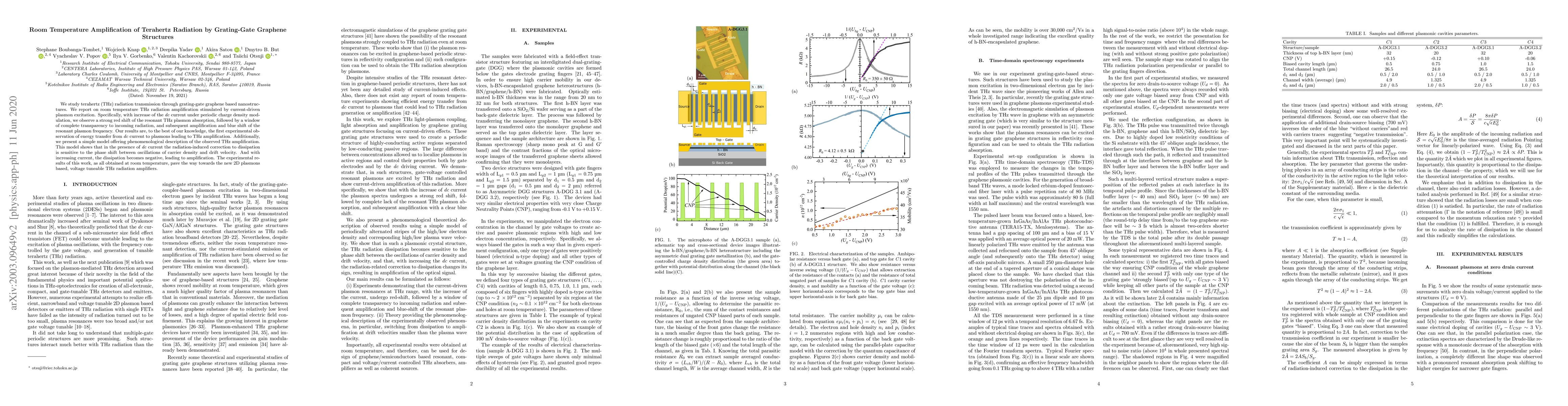 This paper reports on the first experimental observation of room temperature amplification of terahertz radiation through grating-gate graphene structures, driven by current-induced plasmon excitations. The study demonstrates a shift in resonant THz plasmon frequency and its amplification, leading to the development of voltage-tunable terahertz amplifiers based on 2D plasmonic materials.