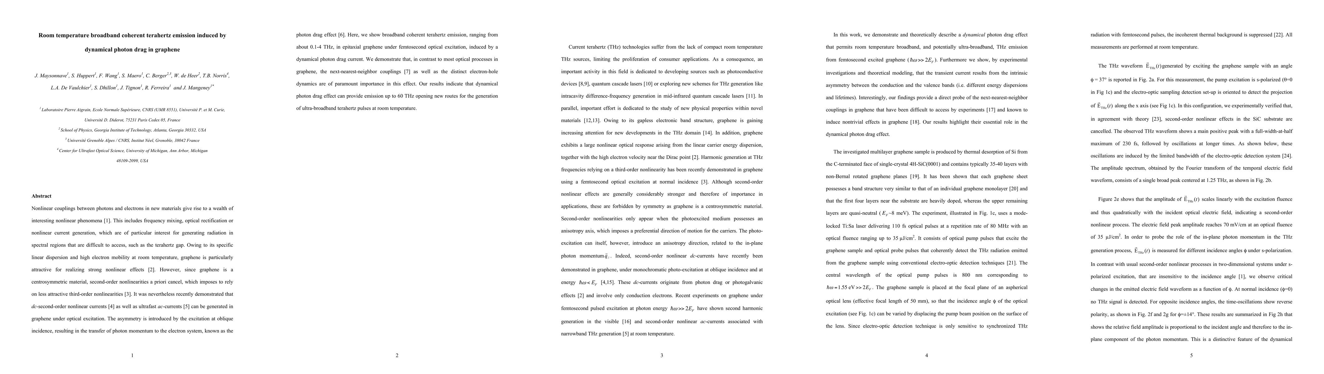 Nonlinear couplings between photons and electrons in new materials give rise to a wealth of interesting nonlinear phenomena. This includes frequency mixing, optical rectification or nonlinear current generation, which are of particular interest for generating radiation in spectral regions that are difficult to access, such as the terahertz gap. Owing to its specific linear dispersion and high electron mobility at room temperature, graphene is particularly attractive for realizing strong nonlinear effects. However, since graphene is a centrosymmetric material, second-order nonlinearities a priori cancel, which imposes to rely on less attractive third-order nonlinearities. It was nevertheless recently demonstrated that dc-second-order nonlinear currents as well as ultrafast ac-currents can be generated in graphene under optical excitation. The asymmetry is introduced by the excitation at oblique incidence, resulting in the transfer of photon momentum to the electron system, known as the photon drag effect. Here, we show broadband coherent terahertz emission, ranging from about 0.1-4 THz, in epitaxial graphene under femtosecond optical excitation, induced by a dynamical photon drag current. We demonstrate that, in contrast to most optical processes in graphene, the next-nearest-neighbor couplings as well as the distinct electron-hole dynamics are of paramount importance in this effect. Our results indicate that dynamical photon drag effect can provide emission up to 60 THz opening new routes for the generation of ultra-broadband terahertz pulses at room temperature.