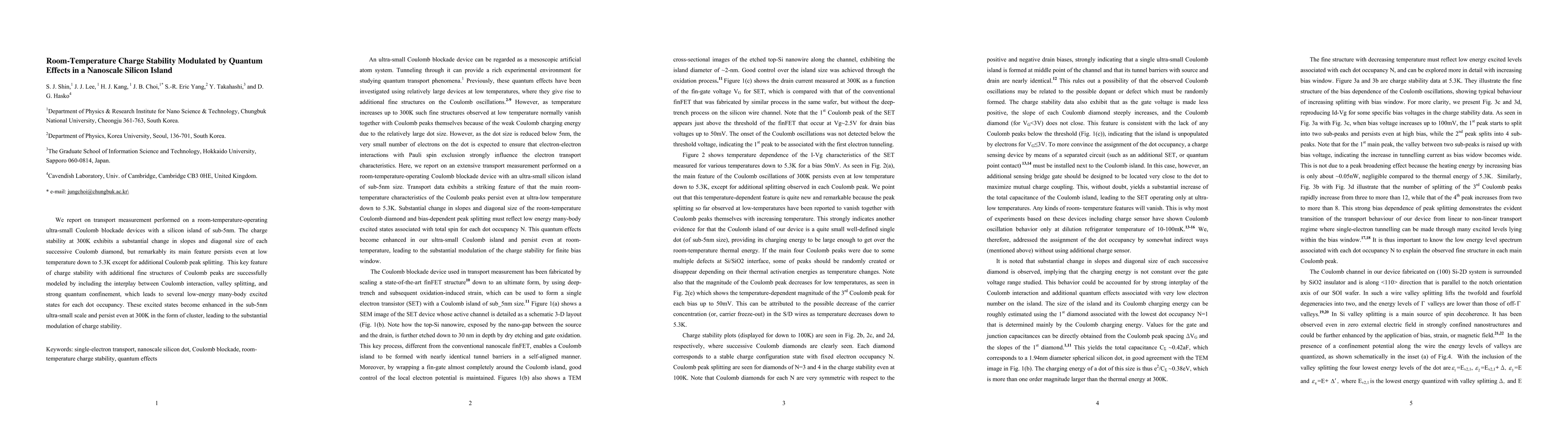 We report on transport measurement performed on a room-temperature-operating ultra-small Coulomb blockade devices with a silicon island of sub-5nm. The charge stability at 300K exhibits a substantial change in slopes and diagonal size of each successive Coulomb diamond, but remarkably its main feature persists even at low temperature down to 5.3K except for additional Coulomb peak splitting. This key feature of charge stability with additional fine structures of Coulomb peaks are successfully modeled by including the interplay between Coulomb interaction, valley splitting, and strong quantum confinement, which leads to several low-energy many-body excited states for each dot occupancy. These excited states become enhanced in the sub-5nm ultra-small scale and persist even at 300K in the form of cluster, leading to the substantial modulation of charge stability.