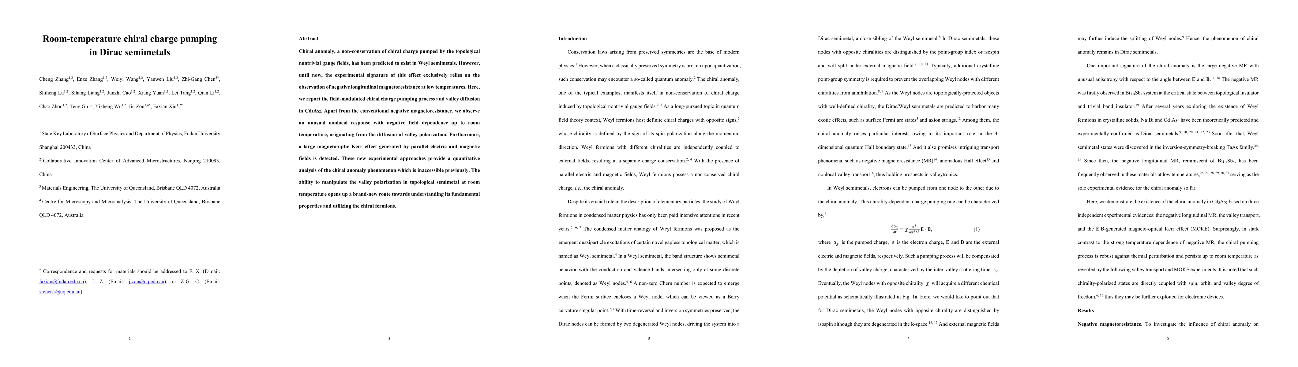 This paper reports room-temperature chiral charge pumping in Cd3As2, a Dirac semimetal, evidenced by a nonlocal response and a large magneto-optic Kerr effect, providing new insights into the chiral anomaly phenomenon previously studied only at low temperatures. The findings suggest new avenues for utilizing chiral fermions in topological materials.