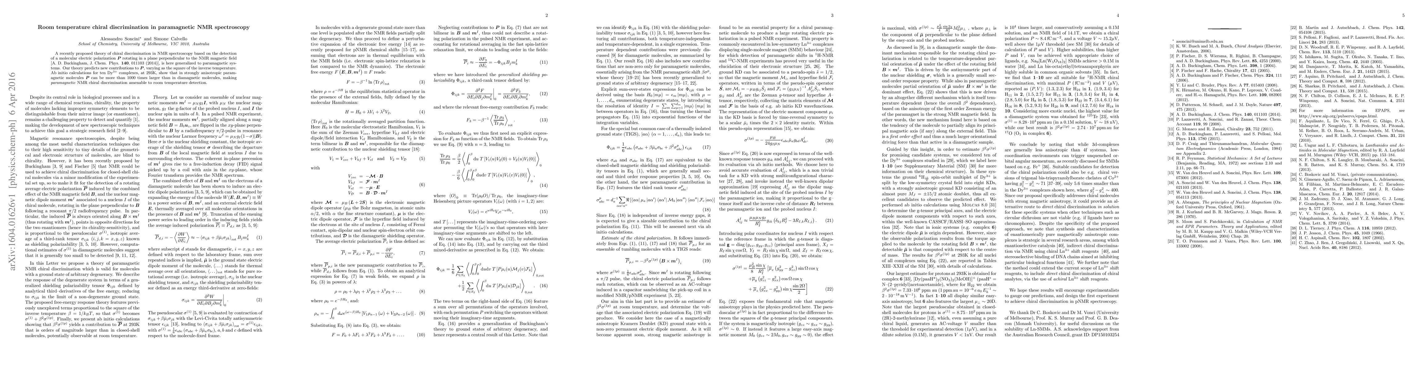 A recently proposed theory of chiral discrimination in NMR spectroscopy based on the detection of a molecular electric polarization $\mathbf{P}$ rotating in a plane perpendicular to the NMR magnetic field [A. D. Buckingham, J. Chem. Phys. $\mathbf{140}$, 011103 (2014)], is here generalized to paramagnetic systems. Our theory predicts new contributions to $\mathbf{P}$, varying as the square of the inverse temperature. Ab initio calculations for ten Dy$^{3+}$ complexes, at 293K, show that in strongly anisotropic paramagnetic molecules $\mathbf{P}$ can be more than 1000 times larger than in diamagnetic molecules, making paramagnetic NMR chiral discrimination amenable to room temperature detection.