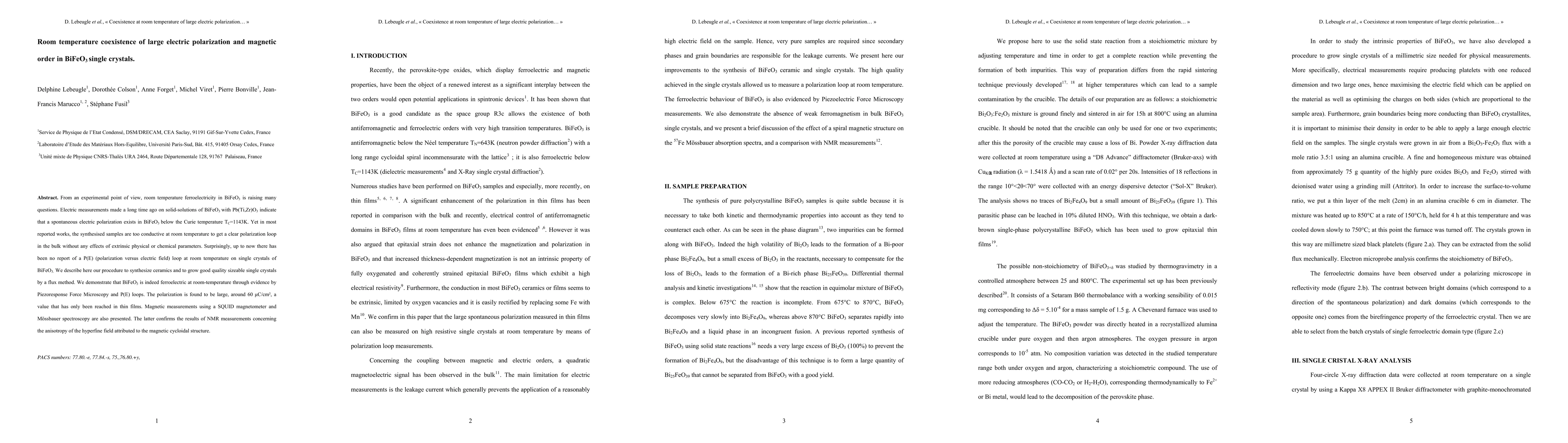 From an experimental point of view, room temperature ferroelectricity in BiFeO3 is raising many questions. Electric measurements made a long time ago on solid-solutions of BiFeO3 with Pb(Ti,Zr)O3 indicate that a spontaneous electric polarization exists in BiFeO3 below the Curie temperature TC=1143K. Yet in most reported works, the synthesised samples are too conductive at room temperature to get a clear polarization loop in the bulk without any effects of extrinsic physical or chemical parameters. Surprisingly, up to now there has been no report of a P(E) (polarization versus electric field) loop at room temperature on single crystals of BiFeO3. We describe here our procedure to synthesize ceramics and to grow good quality sizeable single crystals by a flux method. We demonstrate that BiFeO3 is indeed ferroelectric at room-temperature through evidence by Piezoresponse Force Microscopy and P(E) loops. The polarization is found to be large, around 60 microC/cm2, a value that has only been reached in thin films. Magnetic measurements using a SQUID magnetometer and Mossbauer spectroscopy are also presented. The latter confirms the results of NMR measurements concerning the anisotropy of the hyperfine field attributed to the magnetic cycloidal structure.