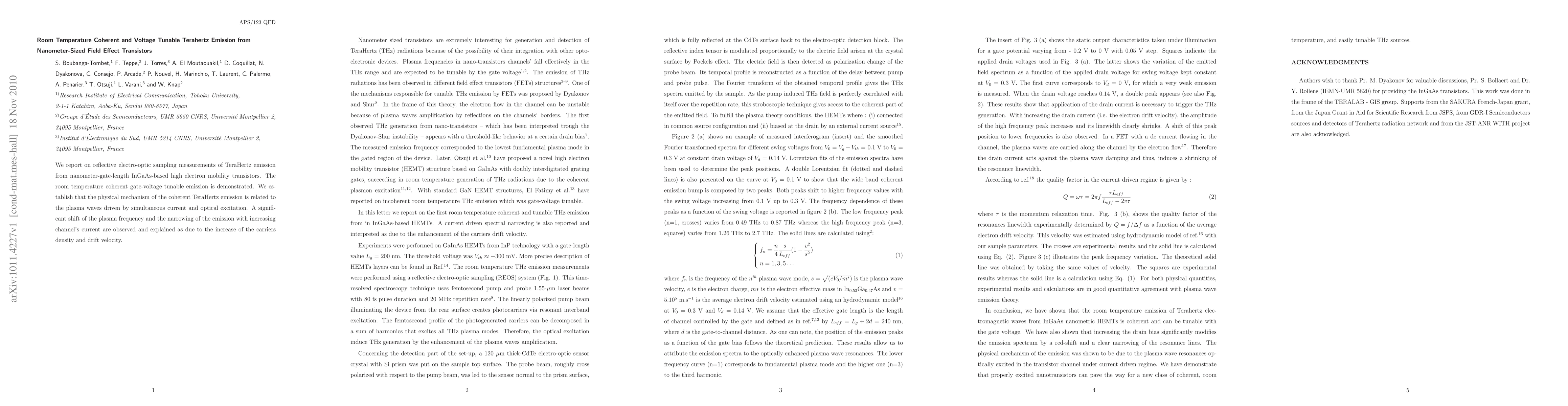 This paper demonstrates room temperature coherent and voltage-tunable terahertz emission from nanometer-sized InGaAs-based field effect transistors, attributing the emission to plasma waves driven by current and optical excitation. The study shows significant shifts in plasma frequency and emission narrowing with increasing channel current due to higher carrier density and drift velocity.