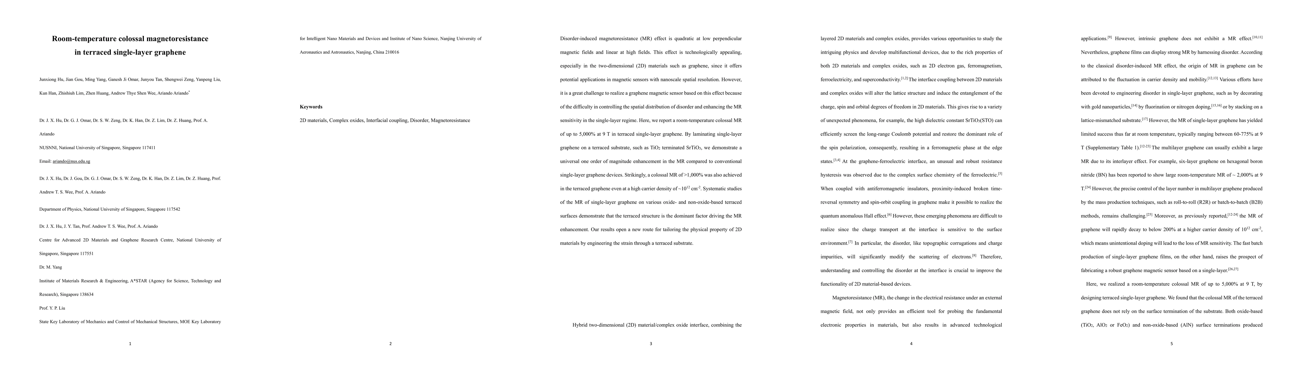 This paper reports a significant enhancement in room-temperature magnetoresistance (MR) up to 5,000% in terraced single-layer graphene, achieved by laminating it on a terraced substrate like TiO2 terminated SrTiO3, demonstrating a universal one order of magnitude improvement over conventional devices. The study highlights the potential of engineered terraced structures to boost MR sensitivity in 2D materials for advanced magnetic sensor applications.