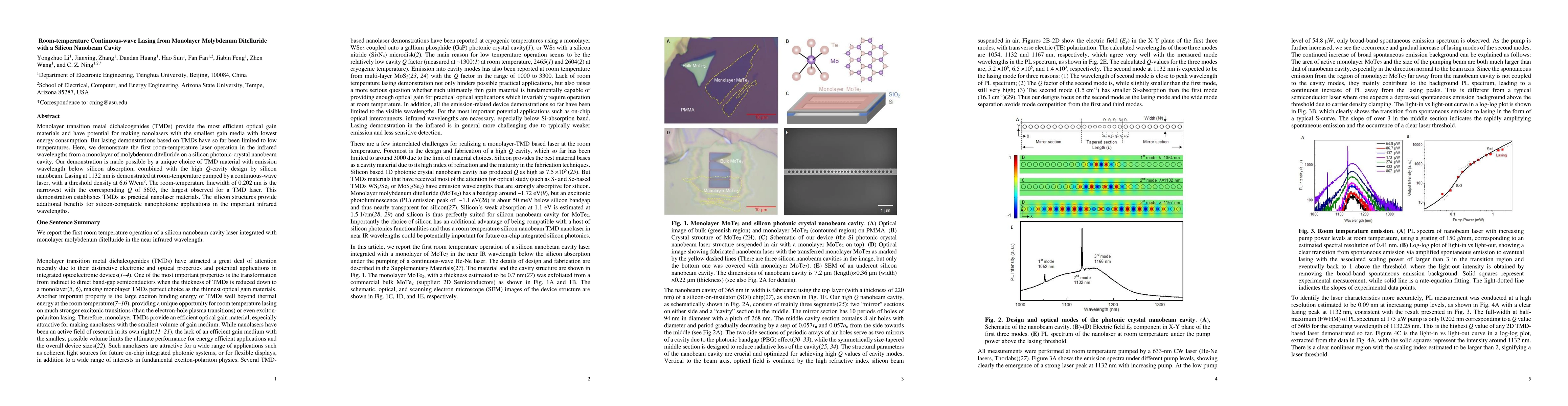 This paper demonstrates the first room-temperature continuous-wave lasing from a monolayer of molybdenum ditelluride on a silicon nanobeam cavity, achieving a narrow linewidth and high Q-factor. This breakthrough positions transition metal dichalcogenides as viable materials for silicon-compatible nanophotonic applications.